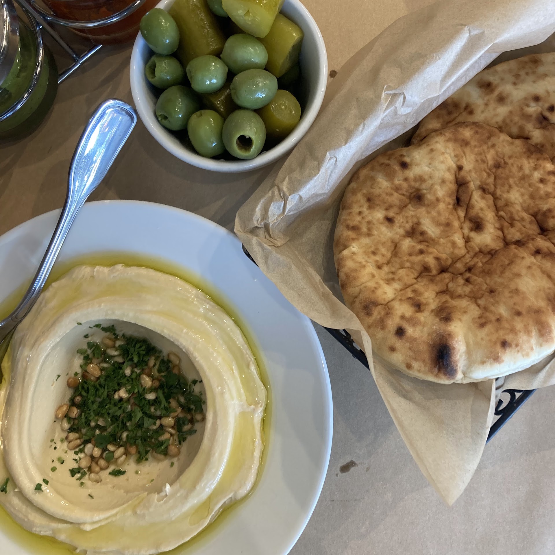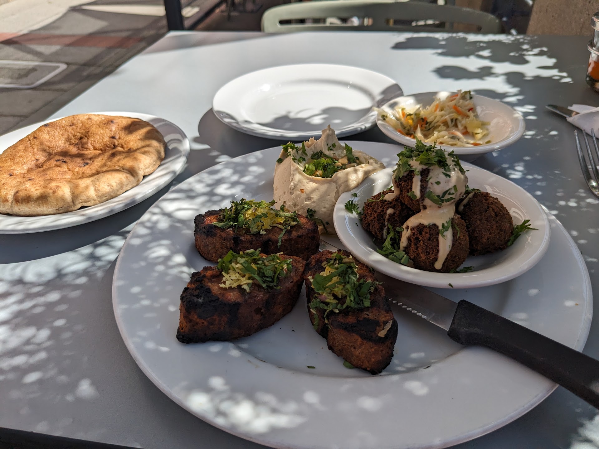 Read moreReally delicious food in a very nice setting. As a vegan, it was really great to be able to try a vegan version of one of the main dishes. The complementary pickles and sauces are a very nice touch, and raise the authenticity a notch. The main dishes are relatively expensive, BUT they are generous, and if you can see in the photo, very finely seasoned! A main plate with a choice of two sides! I definitely ended up with leftovers. I just wish they had a vegan version of their borekas, and maybe a vegan version of topped style hummus. In addition to the pickles and extra tahini on request, one other point I was very impressed with is the bread - freshly made and very fluffy, not the boring bagged/frozen kind you normally find in American Mediterranean restaurants. Falafel was Goldilocks: crispy on the outside, soft on the inside, not too dry, not too oily.