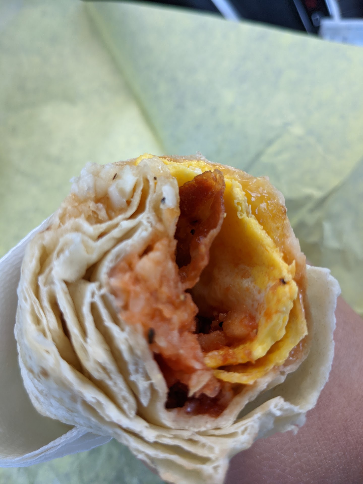 My review is specifically for the breakfast burrito since this is the only thing I have ordered. For a $3.95 breakfast, it is on a smaller size. The burrito comes with a fry egg, your choice of bacon or ham and salsa.