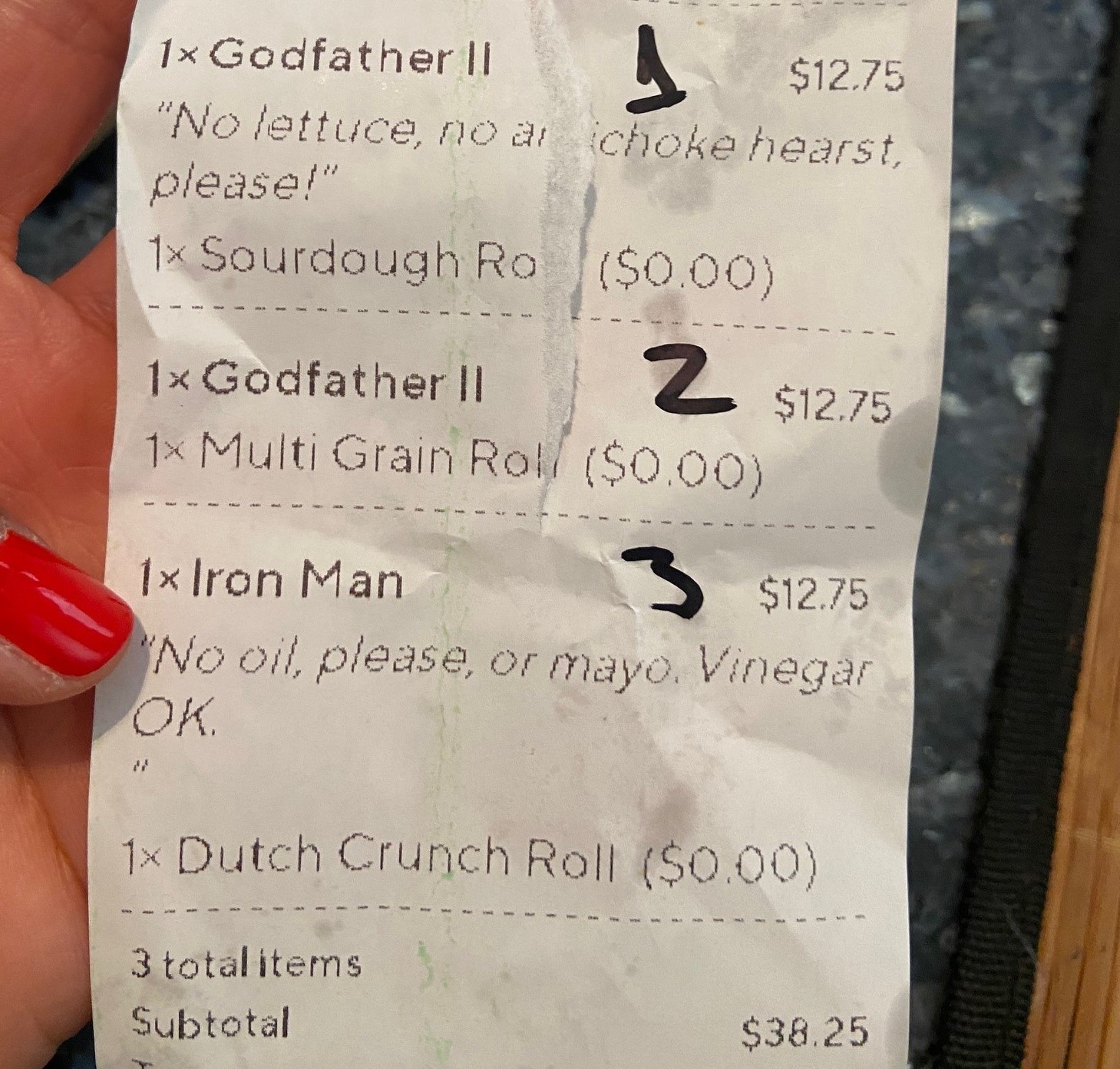 And this is where it really goes downhill (refer to photos I posted). We ordered three sandwiches. Sure we had some special requests but it was not all that complicated (again, refer to the receipt I posted).