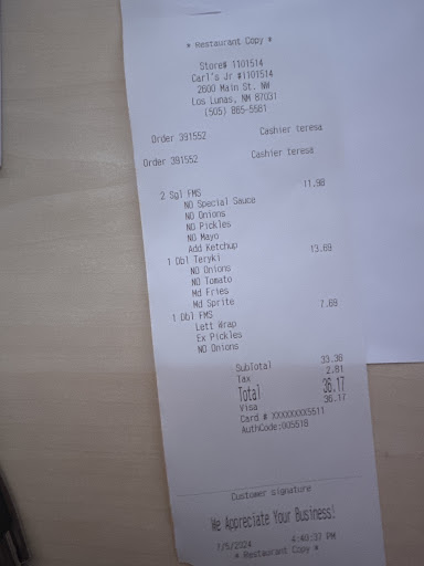 Read moreBeing from California I'm just glad there is a Carl's Jr. in Valencia County. The prices are too high but that's across the board for fast food restaurants--whether it's the franchise or the corporation, it's not okay and you're probably not paying your workers well and keeping all the money for yourselves. Not cool. These workers here are consistently friendly, working hard and deserve better. My go-to for this place is the Jalapeno Poppers and Criss Cut fries. Once in a blue moon I enjoy the guac burger but again, too expensive and the size and quality of the burgers has declined in the last 10 years. Don't think we the consumers have not noticed. Also, you guys do not put enough carbonation in the soda!! Everytime I come here if I dare order a soda, it's FLAT. Would it hoit to check the levels and boost the CO2 a bit? Anyway, my sides are always good, the ladies are always friendly and doing their best. Sometimes there's a bit of a wait but thankfully the food is hot. Dining area is clean the times...