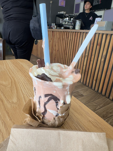 Yesterday I ordered a BusyBee chocolate shake with a burger next door at Lavender Cocinita. It came topped with whipped cream and drizzled with chocolate sauce. How did it taste? Well, a lot like a fast food shake: very sweet, really thick, and it didn't totally melt.