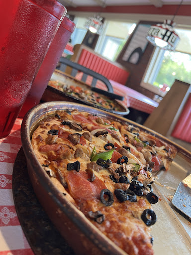 Read moreWe drove all the way from Hanover Virginia to go here. Because most of the Pizza huts in our area have closed down. And this is something that we used to do as a family all the time. So we wanted to make the trip to go to this Pizza Hut.. The service was underwhelming.. We first for looking at a pizza that we wanted to order and you can tell the waitress didn't really want to deal with it cuz she said it took really long to make... And we put our order in. And we're delivered the wrong food.. at first and then had to wait for our second order.. well waiting for that you could just look at the floor was dirty.. The staff looked worn out and I don't want to say dirty but. Just looked completely worn out and we're making excuses for doing things wrong together.... Food came out finally and it was good. Had a hard time getting refills undrinks. And then when it came to getting to go boxes we were giving these little tiny boxes that held like two slices of pizza. When we had almost two full pizzas left and breadsticks. So I had to pack up all of my stuff but you're like nine mini boxes. Which was ridiculous.when my son asked if these are the only boxes they had the waitress did not answer... What you know they have to cuz if they're doing pick up orders they have big pizza boxes. . Yes the only thing saved in this place was the actual food whoever was cooking the food this is one of the best pan pizzas I've ever had from Pizza Hut. In any of its locations.. but other than that the atmosphere in the waitresses were not the reason. We love the old style atmosphere it's great but please keep it clean.. rappers all over the floor trash on the floor in the bathrooms were...