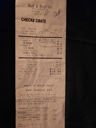 Read moreIf I could give zero stars I would. I just left this establishment wanting to order food for my family after my husband recommended their food. I had my service dog with me and was stopped at the door asking for documentation to prove he's a service dog. My dog was completely in control, not making a sound, and in fact we were carrying him because he's a small medical alert dog. Even after pulling up the ADA regulations for what can and cannot be asked for in regards to a service animal, she still insisted I needed a registration card. I finally got fed up and told them I won't be spending my money there, and would let everyone know that Bud's Broiler on Jefferson Highway not only is ignorant of the ADA law, but refuses to educate themselves in favor of discriminating against disabled individuals. We will not be going back, or frequenting any Bud's Broiler. Don't go there if...