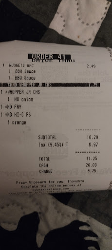 Read moreI didnt get a receipt to do a survey. My husband and I visited this location July 10th at around 3pm. We had ordered 2 bacon kings meals, 8 piece jalapeño cheddar bites and a chicken nugget kids meal. After pulling up to pay. The man working the window, who was dressed as a manager was unprofessional. He gave us our drinks and 1 bag of food. We only had a bacon king burger and 2 fries in it. Missing 1 burger, the cheddar bites, and the kids meal. After trying to tell him what all we were missing he was in too much of a hurry to just get us out and was even ignoring his coworkers that were trying to tell him we were missing stuff. So we pulled up (never got a receipt) Ashley came out with the other bacon king meal and the cheddar bites. We tried explaining that we still didn't have our daughters kids meal and she was FANTASTIC. The ONLY reason I decided to give this location 3 stars because the man they had at the window, didn't deserve a good review at all. Ashley deserves a raise. She made sure to get the rest of our order and even gave our daughter a gold crown which made her day. So thank you Ashley for your customer service skills! You're fantastic!! Don't let her go BK. Good people are hard to find and shes definitely worth every penny! Not sure if corproate will see this or not but just wanted to brag at how...