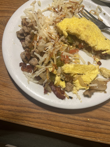Read moreWe stopped by for breakfast. There was no one to seat us although a couple of servers said they would be right back. They weren't. Finally after several minutes we told a server we were taking the booth near the line of people waiting to get in. Our server wanted us to order before we were given menus. She finally handed us menus but demanded we order our drinks right then. The coffee tasted as if it had been left on a high flame for far too long. The server didn't come back for our order until we waved frantically at her. When I tried to tell her what kind of toast I wanted, she said " Yes, you get toast". My meal, which took way too long to arrive, was a cold greasy mess. My toast was not toasted but pale stale bread. My eggs were cold and rubbery. The so called ham was cold scraps of lunch meat and my hash browns were cold pale and very greasy. Since the coffee was so bad, I tried to have her replace it but she brought the same pot of coffee from which the first cup was poured. When I told her it was terrible she shrugged her shoulders and walked away. I wanted to order another drink but she never returned. My husband got up and walked over to her and ordered an ice tea. It arrived after we were done eating. The place was so mismanaged. They were busy but there was plenty of staff and empty seating. I will not...