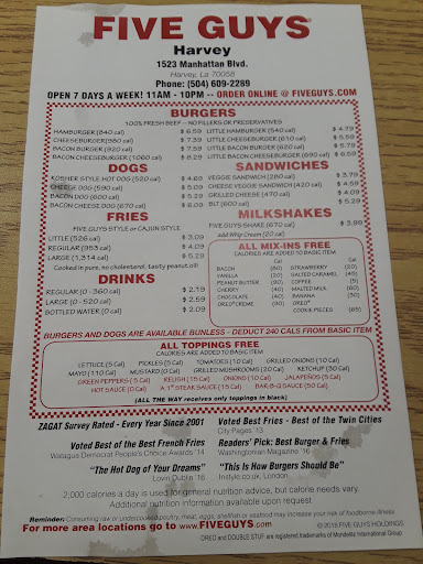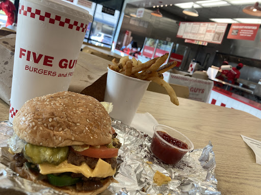 Read moreWe've been to many Five Guys Burger restaurants and have always had a GREAT burger. This time it was good but not great. To much of my surprise our meat was dry and VERY thin today. We've always had two solid juicy pieces of meat on our lettuce wrapped burgers at other locations. My husband's burger was well dressed but as for mine, it was short of having more grilled mushrooms and onions. Also the restaurant was very warm so the shades provided need to be drawn Sooner to keep the area cool while customers/guest eat in a cool atmosphere. We received our order in a timely matter and the workers were all very nice. They were diligent to get the dining room cleaned up when most of the guest left while we relaxed for a minute before getting back...