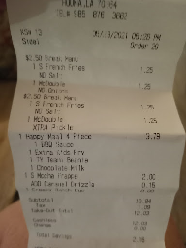 Read moreIm never one to review any place but in this case, something has to be done. I ordered from here with doordash and somehow they got my ENTIRE ORDER WRONG. For starters this order took them 45 minutes to make and give to our dasher. THEN I ordered a small coffee, was given a Large, okay that may seem like whatever, BUT THEN we also got two of the new Mt. Mcdonaldland shakes, one small, one large, and yet we received the same size, and Frappe’s with the pink whipped cream (WHICH TASTED ABSOLUTELY HORRENDOUS, idk if it is expired or if that’s just the taste but it is flat out nasty) and m&ms on top of this monstrosity? In what world is that the same thing? If they were out of the item, okay that’s fine, but why purposely give us the wrong beverages? then MAKE IT TWICE?? Then ONTOP of that, we ordered a happy meal, ordered extra fries GOT apples, then ordered a coke and got a Dr. Pepper. So quite literally the only things that were correct who the hamburger in the happy meal, AND THE TOY? Seriously? I say this as kind as I can but were yall on crack? I understand things maybe being out of stock, but to give us this made off the fly mumbo jumbo was such a waste of time and money. Please get new employees who actually care about the food being served to paying customers. Because this is flat...