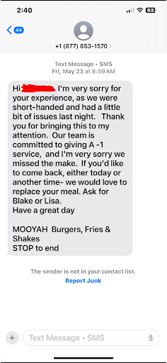 As a longtime customer who has recommended Mooyah to many others, I am disheartened. Your food may be good, but unprofessional staff attitudes like this will drive loyal customers away. Tonight you didn’t just lose a sale—you lost a customer who has supported this...