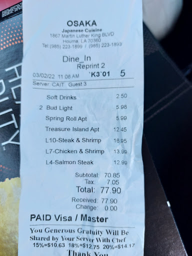 Read moreWant to take a min. To thank everyone from to the girl in training. (Keep up the good wk. you are doing great job.) To the owner, I really, really, really appreciated seeing your interaction with your staff truly commendable and to our wait staff everything on point your high spirits and story telling was very enjoyable, to our singing cook seek that singing career. And to everyone there that we didn't get to meet, you are doing a good job. And so I just wanted to commend everyone for the great experience we received. You really did a great job. I feel like you and your staff made sure that you directly or indirectly acknowledge everyone at out table thank you for that. I don't want to speaker for everyone in our party but If I could I'd give you 5 stars for the 15 people that was in our party that would be the best way I can say you did a great job in helping make our experience a truly great one. So keep up the good wk. Osaka, you will be seeing us again. Thank you again for helping make this a more memorable occasion for us....