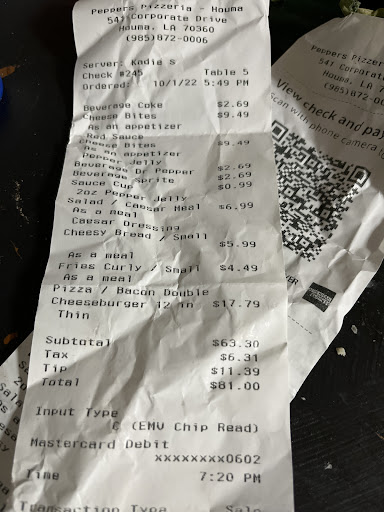 Read moreI love Peppers. It is my go-to pizza in Houma. But my experience tonight was very different, borderline insulting. I ordered my usual triple pepperoni pizza - hand-tossed with light sauce and extra cheese. What arrived at my table was indeed triple pepperoni pizza ... but dripping in grease, very little cheese, and crispy thin crust. I understand even the best restaurants miss from time to time, so I was willing to give Peppers a pass. Their track record was too good. So I called over a manager to let him know my pizza came out wrong. After repeating my order to him, he replied in a matter-of-fact tone that I should expect greasy pizza with triple pepperoni and that what was on my pizza was indeed extra cheese. He surrendered that it was actually thin crust. And, seemingly for that reason alone, he was willing to replace it with a new pizza. BUT he recommended that I change the order to regular pepperoni (to avoid extra grease) and go with double cheese (maybe to make it seem like cheese is actually on the pizza). What he brought back to me came across as a mockery, like a sarcastic response to my request to make my pizza right. Pizza No. 2 was now hand-tossed but drowning in sauce and blanketed with a thick layer of cheese, burying the pepperoni. It came across as the equivalent to, "You want extra cheese? Eat this!"