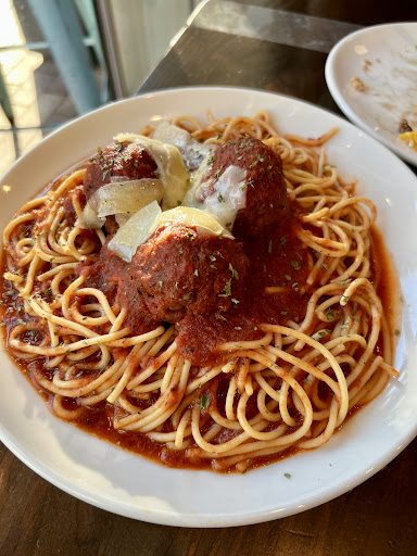 We were seated promptly on arrival. I must say I did enjoy the atmosphere/ambiance. They have indoor and outdoor seating which is nice. Loved the natural light that comes in from the windows. Our waiter was cool! He offered suggestions and also answered questions. I decided to try the Peachy Greens salad, the Flambee Brie and Frozen French for my adult beverage. My son split the salad with me and ordered the spaghetti and meatballs.