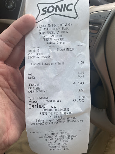 Read moreFirst off I tried to order a small combo. The girl that was helping me did not tell me that Sonic does not offer small combos and instead charged me for a medium and sent out a small. The screen also didn't work on the car hop station so I had to get her to read the order back to me. When I got the order at the car and questioned my receipt she (carhop, not sure if same as order taker) said that they do not have small combos. She took back my tots and not the drink to make it a medium. Also ordered the burger with light mayo, no tomato and add bacon. I got bacon but I also got 2 tomatoes and in no way light on the mayo and had to use 2 napkins to wipe it off. My question is why didn't I get told that there is not a small combo and was charged for a medium? Very unprofessional order taking. Sounded like was ruining her day for ordering at Sonic. Thanks for that feeling. I worked at Domino's for 6 years until I got out of the food service business and I have seen my fair share of horrible employee's. Never going to Sonic on Coursey again. Thought it would be nice since it's by...