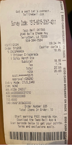 Ā Ā Ā Read moreI ordered Taco Bell and had a bug wing grilled into the tortilla on one of my burritos. I bring it, only one item out of my whole order, back to get my money back because I understand things happen, I just canāt eat this. So then I was accused of putting it in there because they donāt have any moths in Taco Bell. Iāve worked in several restaurants and would have appreciated someone discretely telling me about a problem. I am appalled that I had to argue about something that was cooked...