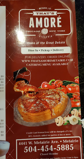 The Chicago style pizza is true to the structure. If you have never tried Chicago style pizza and have been wanting to, I definitely recommend trying That's Amore's version. It does appear to be properly prepared and is very, very good. It may seem expensive for a pizza, but let me assure you, it is a good value. I doubt there are many people who can eat to slices. I am a big eater, and I could only manage a little over a piece and a half. And it is not crust; the crust is thin. It is the ridiculous amount of topping and cheese. My quibble is with the sauce. Chicago pizza does not use a typical pizza sauce but special canned tomatoes. We were recently in Chicago and ate the real thing at Lou Malnati's as part of a food tour. The host at Lou Malnati's gave us a detailed explanation of the history and process of Chicago style. Pizzeria Uno in Chicago is credited with the concept, but Lou Malnati was supposedly the chef/cook who developed the recipe. Making a Chicago style pizza takes 45 minutes, and it seems like That's Amore has that part right. The crust, which is thin, not thick, is piled with a ton of topping (I like Italian sausage) and mozzarella and baked for 20-25 minutes. The crushed tomatoes are then added and the pie is baked for another 20 minutes or so. The finished product is over an inch thick, most of it topping, cheese and tomatoes on the thin crust. I think if That's Amore used proper tomatoes instead of their sauce, their Chicago style pizza...