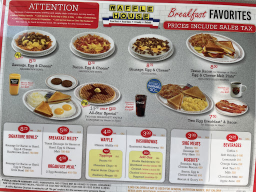 Read moreSo I usually go in the mornings and we have a good time- however tonight we were feeling for some breakfast for dinner. We walked in and a lady named Abby told us to sit wherever and we did. We waited 8ish minutes to get a drink order and got them quick-… and then the waiting happened. We already knew what we wanted and just waited for Abby to take our order, however 20 mins in waiting, we noticed the people that came second to us got served first, no biggie we thought we’ll be next- wrong. 10 (maybe more) minutes pass and Abby comes to our table (after waiting about 30-40 min for a food order), apologizes, and we were nonchalant and just placed our orders. We wait another added 20 mins- which is a reasonable food making waffle house wait time. We got our order and already off the bat i noticed a bit of egg in the bowl i ordered that i requested no egg for. Luckily i’m not that picky and just plucked it off. As i ate my bowl and my bf ate his food, we were still waiting for the waffle to his all star meal. We wait 15 mins and we had enough, so i just went to the register and asked for the receipt and waffle to-go. She seemed annoyed with me even though I been nonchalant with this, and i just wanted to go home. We paid for it, and as we waited- we overhear the staff said something about a waffle being burnt- and Abby, says she’ll serve that to us and be done with our order- not caring if its severely burnt, but i think the manager told her no. So Abby prep up another and was kinda throwing around our late waffle order - getting more annoyed by having to fix her problem. We got our food and finally left by 9:05pm (we got in around 7:49pm). Everyone else there seem chill, that manager seem cool and got everyone in a flow there,...