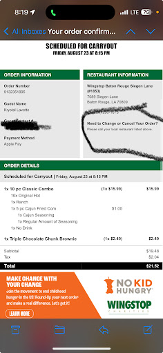 Ordered my food online and it told me waiting time was about an hour. It was a Friday so I understood. Showed up when my food was expected to be done and STILL had to wait another hour! Nobody greeted me even tho I walked in and out multiple times. But every other person before and after me got greeted. The kitchen workers (2 total on a Friday night) were arguing and yelling and threatening to fight some customers that were unhappy with their orders. I had to walk out at one point because it felt so unsafe and like at any moment shots would pop off. They told me after 2 HOURS of waiting for my food that they were out of fries. It took 2 hours for me to get 10 boneless wings and no fries. I asked for a refund instead and she said she couldn’t give me one. Asked for a receipt to show what time I actually received my food vs when I ordered it, and she said she could not even print me a receipt. Hands down the worst location and worst staff I’ve experienced so far. No wonder I see so many wingstop management positions on indeed every week. Smh. Hopefully management will address the issue with whoever worked night...