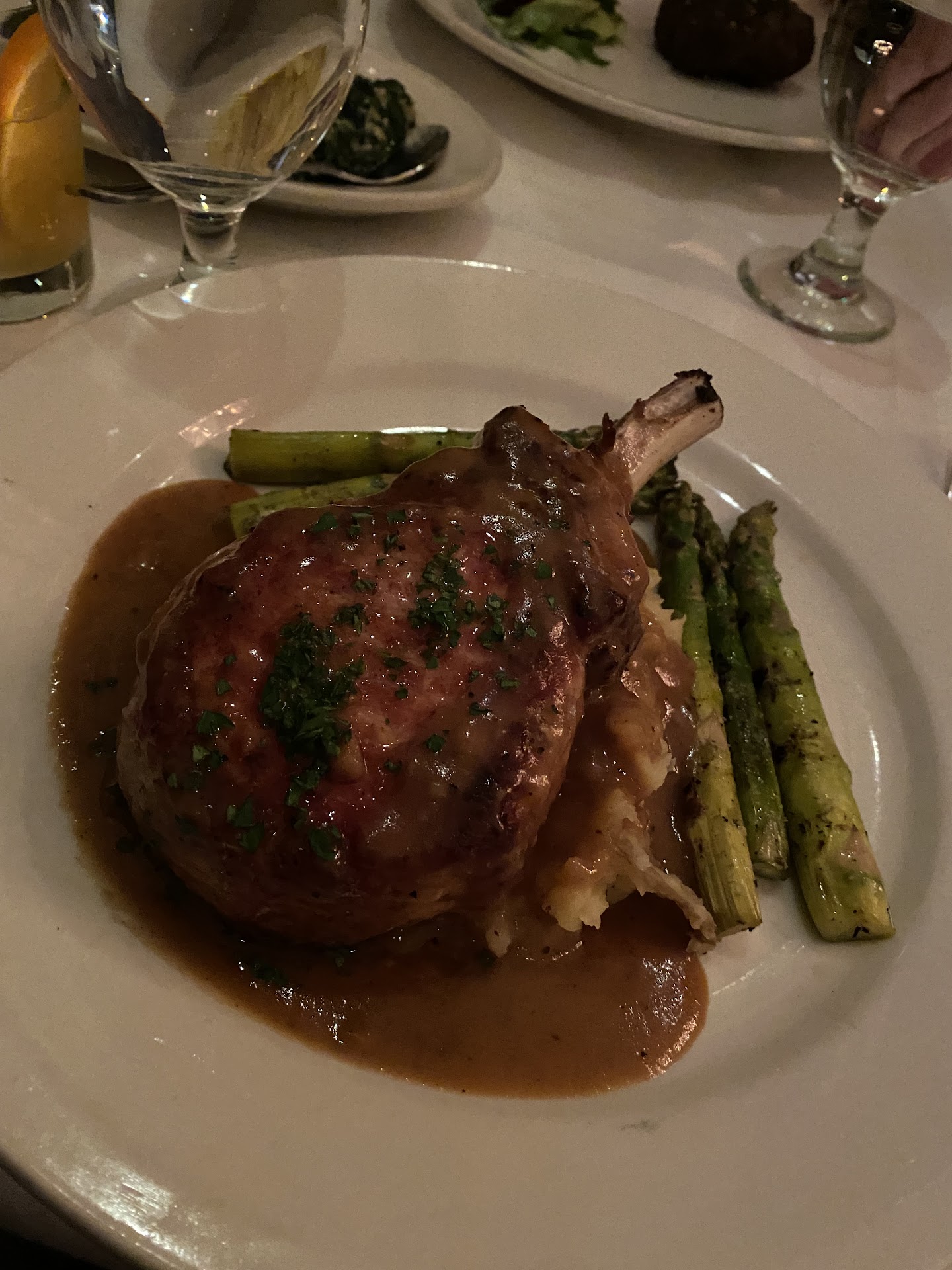 Overall the food was nothing to rave about, and we felt like we could’ve cooked a better ribeye at home. My sister got the seafood crêpes, they were stuffed with lobster shrimp, and a fish, which were all shredded together, So the flavors of the individual seafood we’re all lost. The flat iron chicken was dry and overly topped with fried onions. The grilled artichoke was completely charred and any flesh was dry. Maybe it just wasn’t there best night, but it’s an expensive place to have so many things wrong with the food.