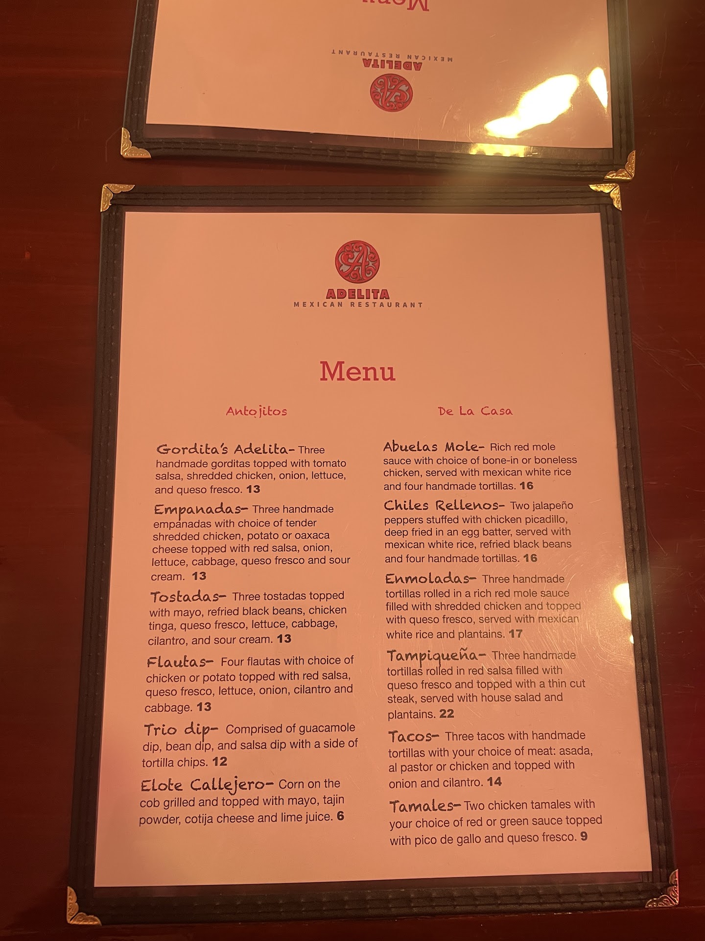 Read moreI've eaten here several times now after seeing a recent post on Next Door. I think it bears repeating, this place is what your Mexican mama would make if you had a Mexican mama. This is home-made Mexican food, unlike anything else I've experienced in this city. I'm working my way through the menu and everything I've had so far (tamales, chiles rellenos, emmoladas, abuelas mole, elote callejeros (corn on the cob), flan (custard), te de fruta (hot fruit tea), and horchata (cold rice milk with vanilla and cinnamon) is a chef's kiss to authentic Mexican cuisine. You can't get beer here because they don't have a liquor license yet, but, that is easily remedied by walking across the street to Walgreens and then heading a few blocks east until you get to The Shop, a craft beer and bottle shop (2708 Frankfort Avenue). Where else, except Frankfort Avenue, can you get such a perfect pairing (Adelitas Mexican Restaurant...