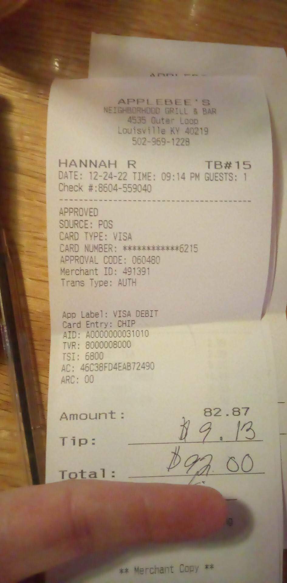 Okay I understand it is Christmas Eve and people don't want to be at work, but I have NEVER had service this bad. Id give zero stars for this experience if I could. We decided to go out for dinner. Applebees is a local favorite of ours so we were excited they were open. There was no wait, seated right alway by the hostess. Our waitress came over and asked for our drinks. Her name was Hannah. She started off complaining right off the bat. She hurt her shoulder. My husband ordered a frozen Christmas special. It was Pina colada type drink. My brother ordered the other Frozen Christmas drink, a cranberry vodka drink. My daughter and I ordered sweet tea. We also ordered the sampler appetizer. Hannah came back and told us we couldn't order the sampler because they were out of shredded cheese. ok fine whatever... we waited a good while then flagged someone at the bar to ask about our drinks and food. The bar tender had their drinks waiting on the bar. The guys got their mixed drinks but had to ask again for our sweet teas. It was NOT busy at all in there. We were there for over 3 hours! Food took forever but was good. Husband ordered parm shrimp and steak, I ordered bourbon steak. They were both perfect. but brothers food 8oz steak was forgotten and we were finished eating before he got his food. Granted it was fresh and delicious as well. Food was 5 stars and AMAZING HOWEVER service was horrible. Hannah was inattentive. We had to ask the bar and two other servers for drinks and ask about our food. My husband went to the bar twice. She was super rude also. She was too busy standing around talking to serve us. Then there was extra beer added on our tab. I pointed it out to her and she corrected it but just her overall attitude was bad. Sad because we eat there all the time. I will request to move if I ever get stuck with her again. No last call. My brother tried to order a beer for over 30 minutes just for her to walk away and send the manager over to tell us the bar is closed. The Manager wasn't any better. When we tried to tell him we had been trying to order drinks he said well we closed at 9p. which I totally understand it was 9:15p but we had been trying to get service for quite sometime. Others scoffed like it wasn't a surprise when we complained about our server. One even said "Good luck" Like if you know your server is this bad why do continue to employ them and give poor service to paying customers? Its Christmas Eve, I tipped but normally tip much better around the holidays. She missed out and lucky we tipped at all because honestly she didn't deserve it, but again our food was delicious and honestly a guy taking care of another group near our table was super nice and friendly to us. I hope she has to share our tips with other who were more deserving. I'd tip the bar tender and cooks only if that was an option. I won't say I won't go back because I have been many times and gotten great service, but this was our first time with Hannah and she...