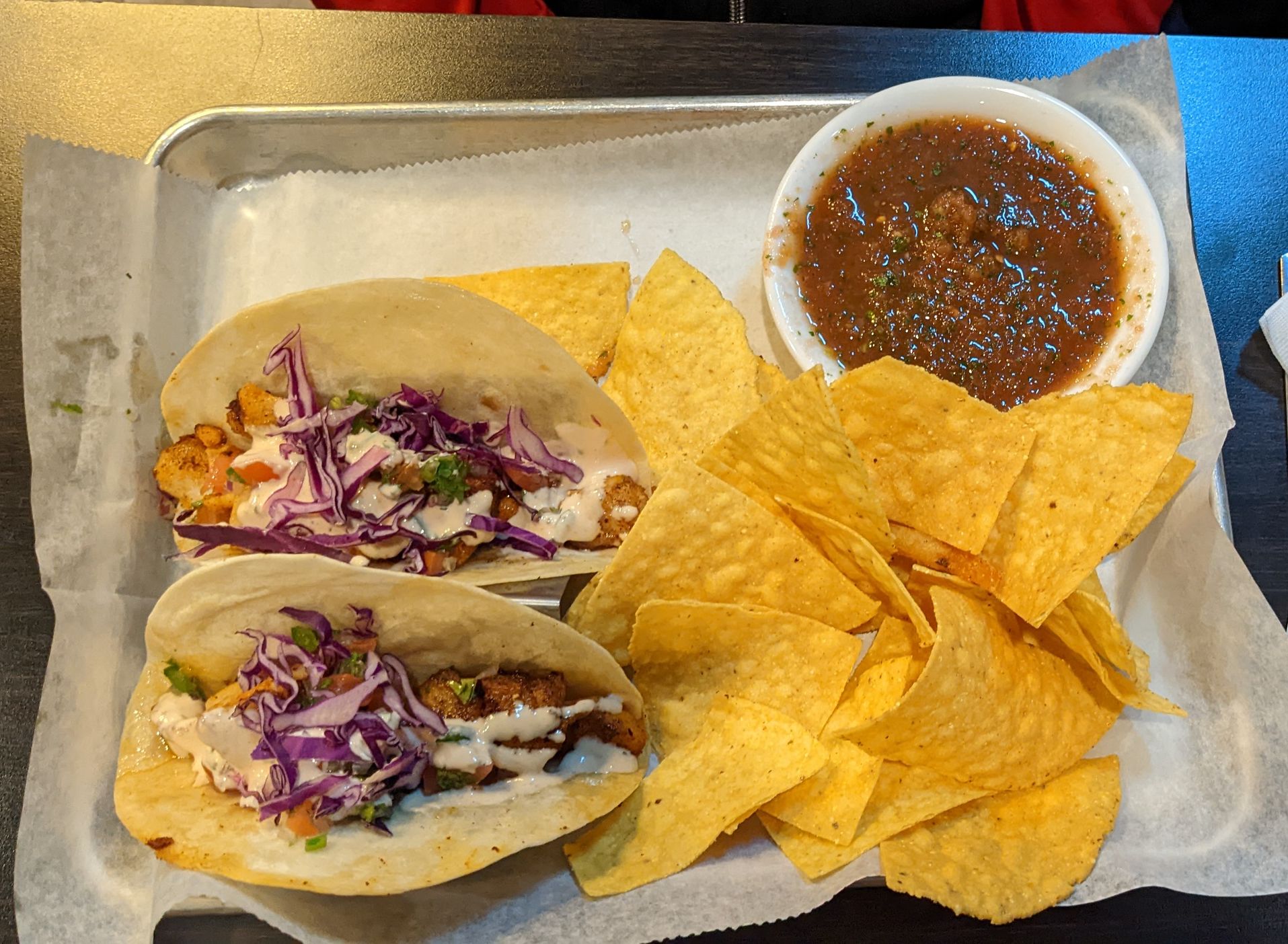 My wife ordered the Fish Tacos. She had a choice of either flour or corn tortillas for her shells. The tacos arrived with blacked fish, avocado, cabbage, and a few lines of chipotle lime crema. She couldn't find the pico de gallo as mentioned on the menu. The tacos were accompanied by a nice portion of chips and salsa. My wife enjoyed the fish tacos. She did mention they were not bad, but she has had better. She did think the salsa which came with the chips was very tasty.