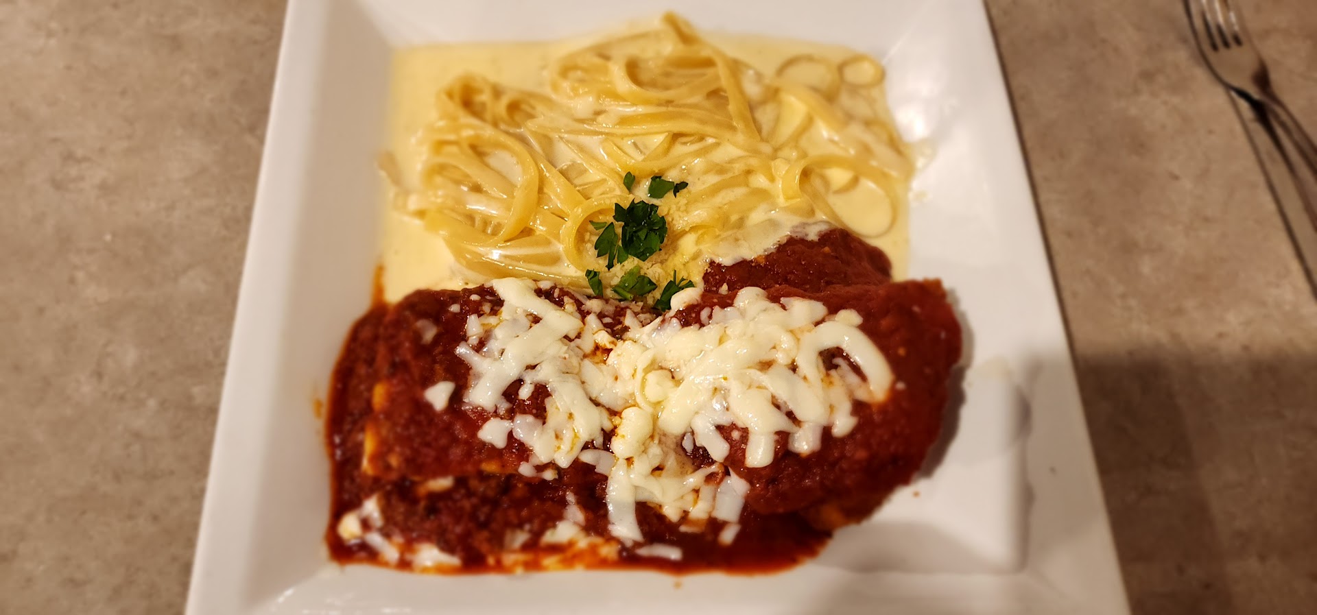 I was seated right away. My order of, I believe it was called tour of Italy, was placed. This plate included fettuccine Alfredo, lasagna, and chicken parm. The food came out incredibly fast. I immediately took a picture of the plate, knowing that there was no way the pasta was made fresh with the little amount of time it took to teach the table.