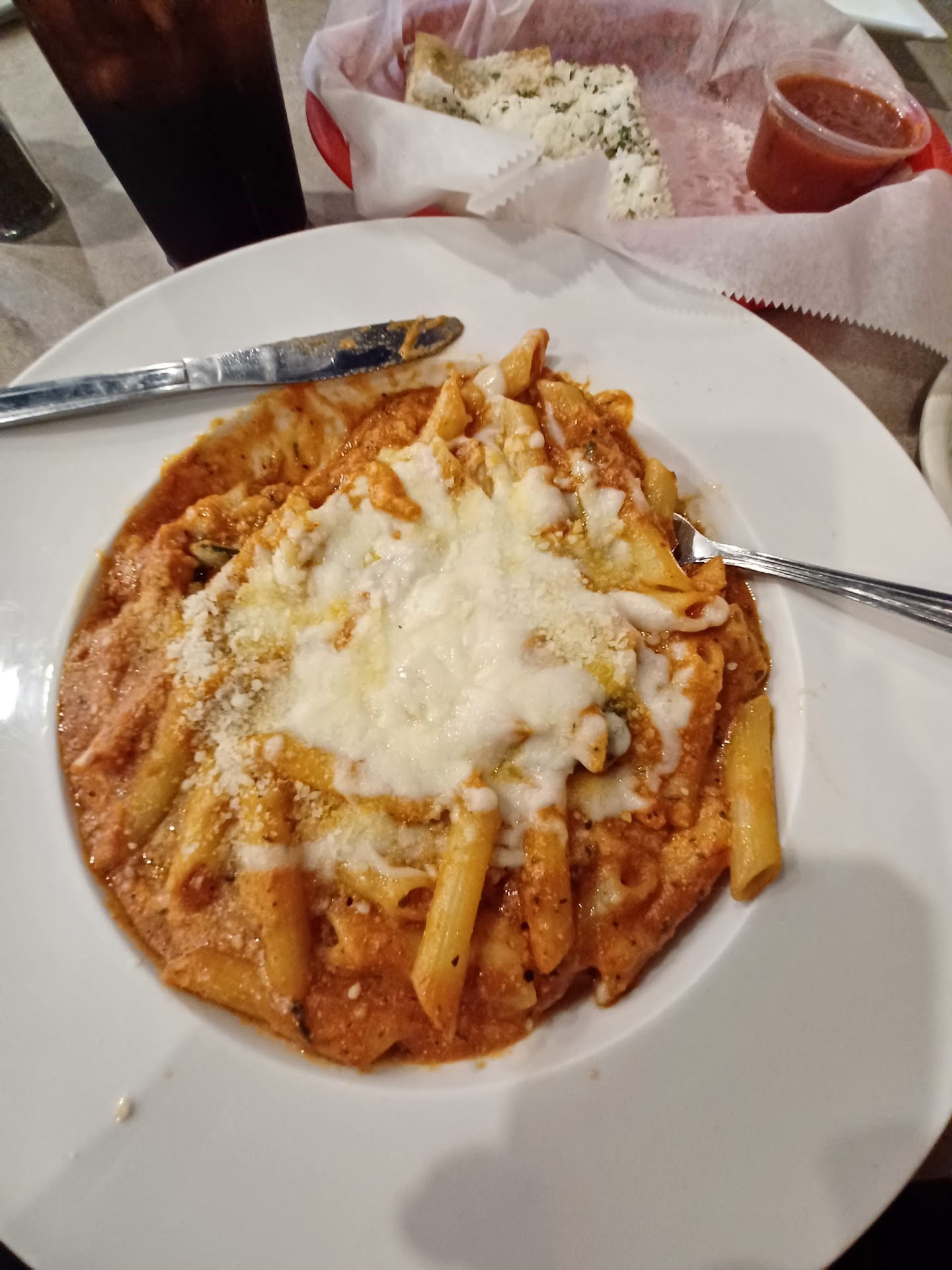 Wait staff were prompt and seated us right away. Our waiter however could not remember anything. He brought us bread and sat it on the table behind him and forgot he sat it there. The bread was good but has powdered parmesan from a can. Everything has powdered parmesan on it. The marinara that comes with the bread is really good.
