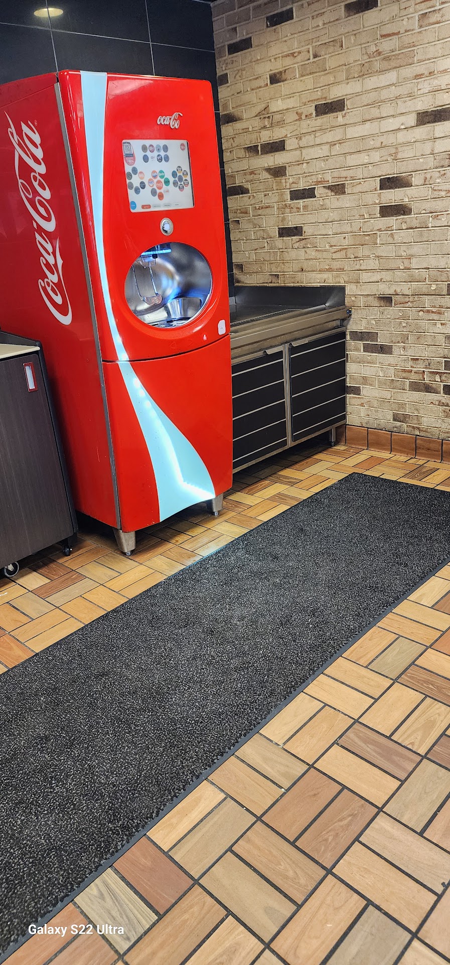 I ordered a soft drink instead of coffee. There was a Cambro container catching the water that was dripping from the soda fountain, and standing water around the machine. I had to be careful not to slip. Half of the options on the soda fountain were blacked out.
