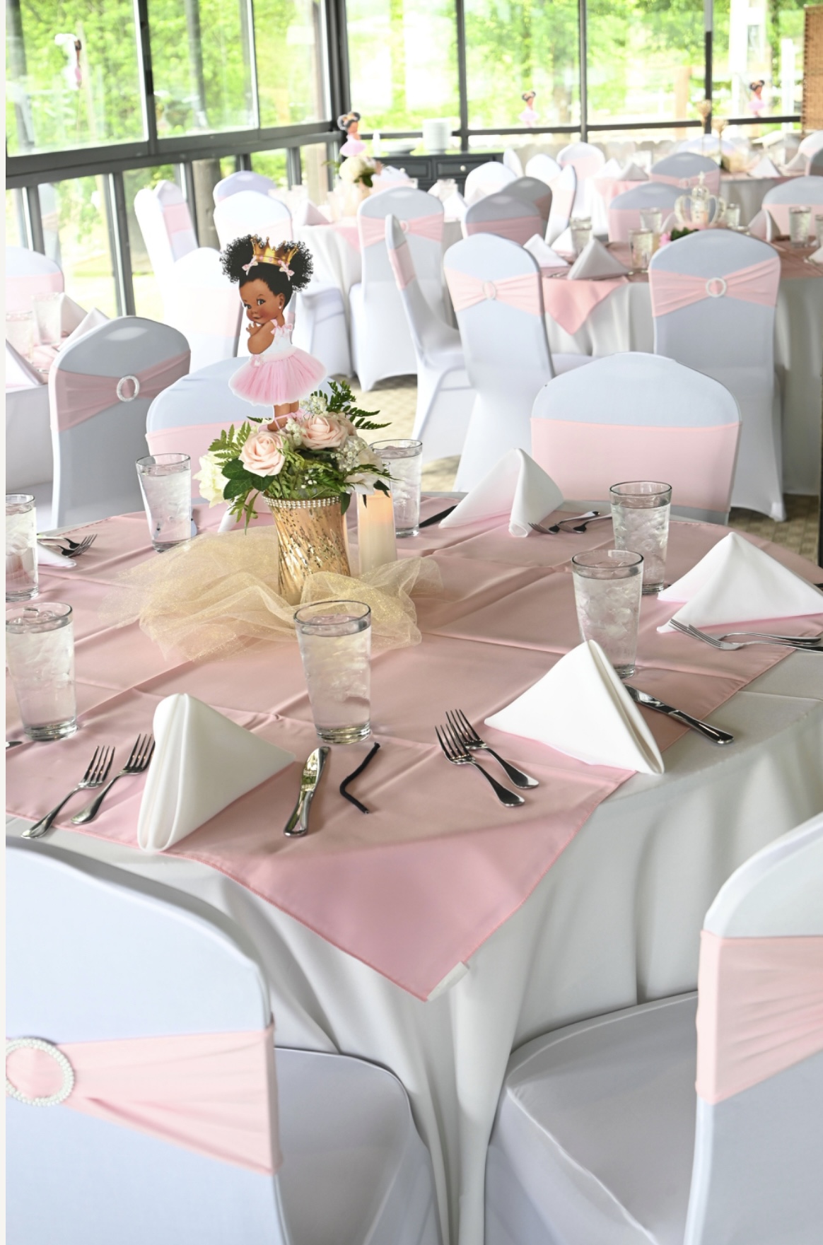 Captain’s Quarters provided beautiful white table linens with pink toppers, and my decorator added elegant chair covers and extra touches that brought the entire vision to life. The staff had everything set up and ready for us, which made things so easy. Everyone was professional, kind, and attentive.