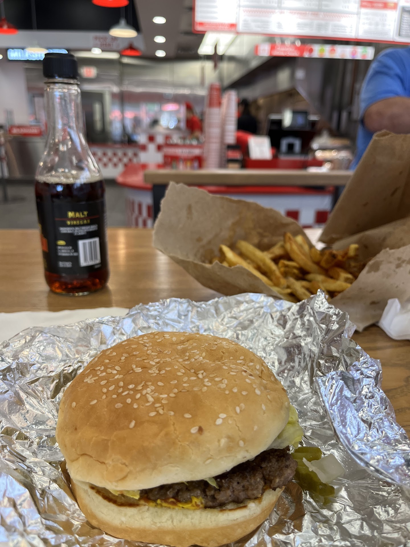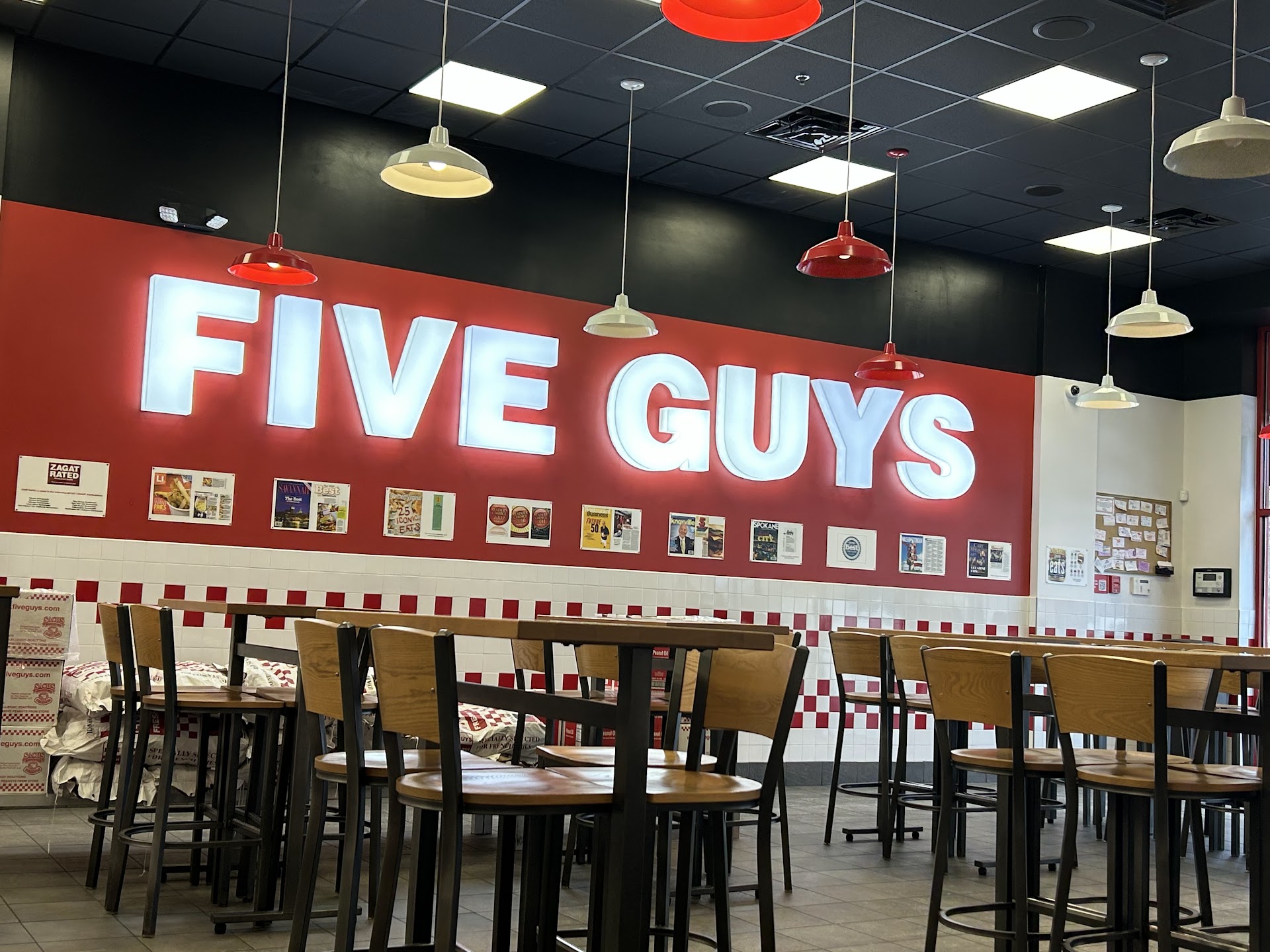 Honestly, my only complaint has nothing to do with Five Guys. There was a man in there walking around with a Tablet doing an inspection (did not appear to be health department). I could not make out the name of the company he worked for, but, I believe it started with an "S". While performing his inspection I observed him reach into a box of peanuts, roll a trash can away from the wall, touch all the high chairs, walk outside touching the door handles, then back in to inspect the kitchen (all without washing or sanitizing his hands). There was another occasion he walked outside to the outdoor seating area and allowed the door to slam in a customer's face who had a handful of food and drinks. Again, this has no reflection on Five Guys, but, perhaps the owner could get this feedback to the inspection company that was on-site...