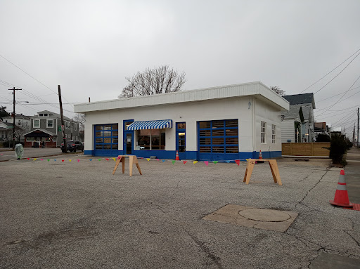 The blue painted picnic tables out front front still out ontothis triangular "traffic peninsula space which makes for an interesting spot to sit outside when the weather is nice and enjoy the many treats they serve as cars avoid collisions at an intersection that is certainly the envy of any self-respecting figure 8 stock car track.