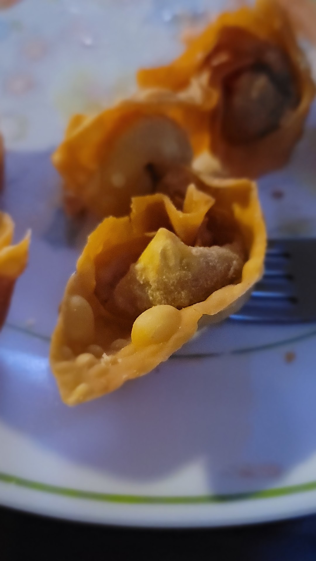 Read moreBourbon and Orange chicken was OK. Seems like they filled the container with a lot more rice than chicken. You used to get a whole container of food and a small container if rice but not these days. The wonton's are the worst. Want to talk about shrinkflation...wow. These used to be much bigger and made with a crispy dough like the crab ragoon but not anymore. They are so small and you can't taste the meat, just the grease. See pics below, the fork is for size reference. Will not order this again. Egg rolls are descent but for the price...not worth it. Good thing a friend had a delivery gift card. Would not have been worth the $60 for 2 dinners, small fried rice, egg rolls, crab ragoon, fried wonton's, order of sweet...