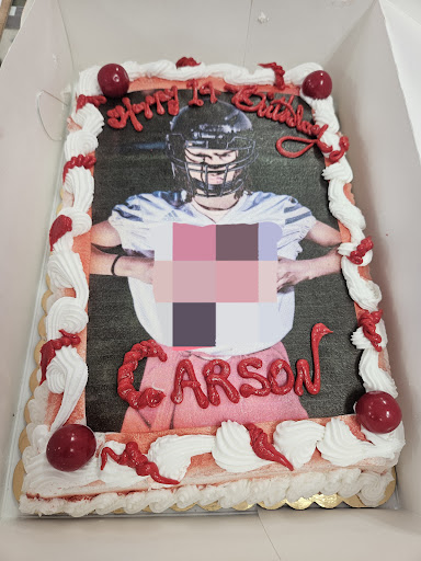 I called on the 17th, placed my order with the lady with the glasses that has been working there all the years I've been buying cakes. We talked about the design and she suggested a few things and we agreed that it would be a picture of my son in his football uniform, a red and white boarder, footballs on the corners, and it would say "Happy 14th Birthday Carson". It would be ready for pick up at 10am on the 19th of October.