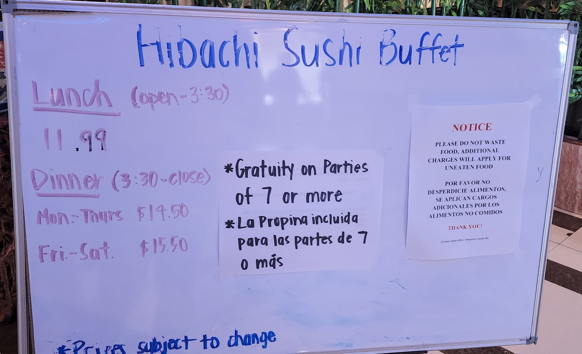 I also hated the fact that they had a sign that said, " Uneaten food will be charged a Fee" ....In my opinion, that sign is ABSOLUTELY TACKY...isn't it a BUFFET??