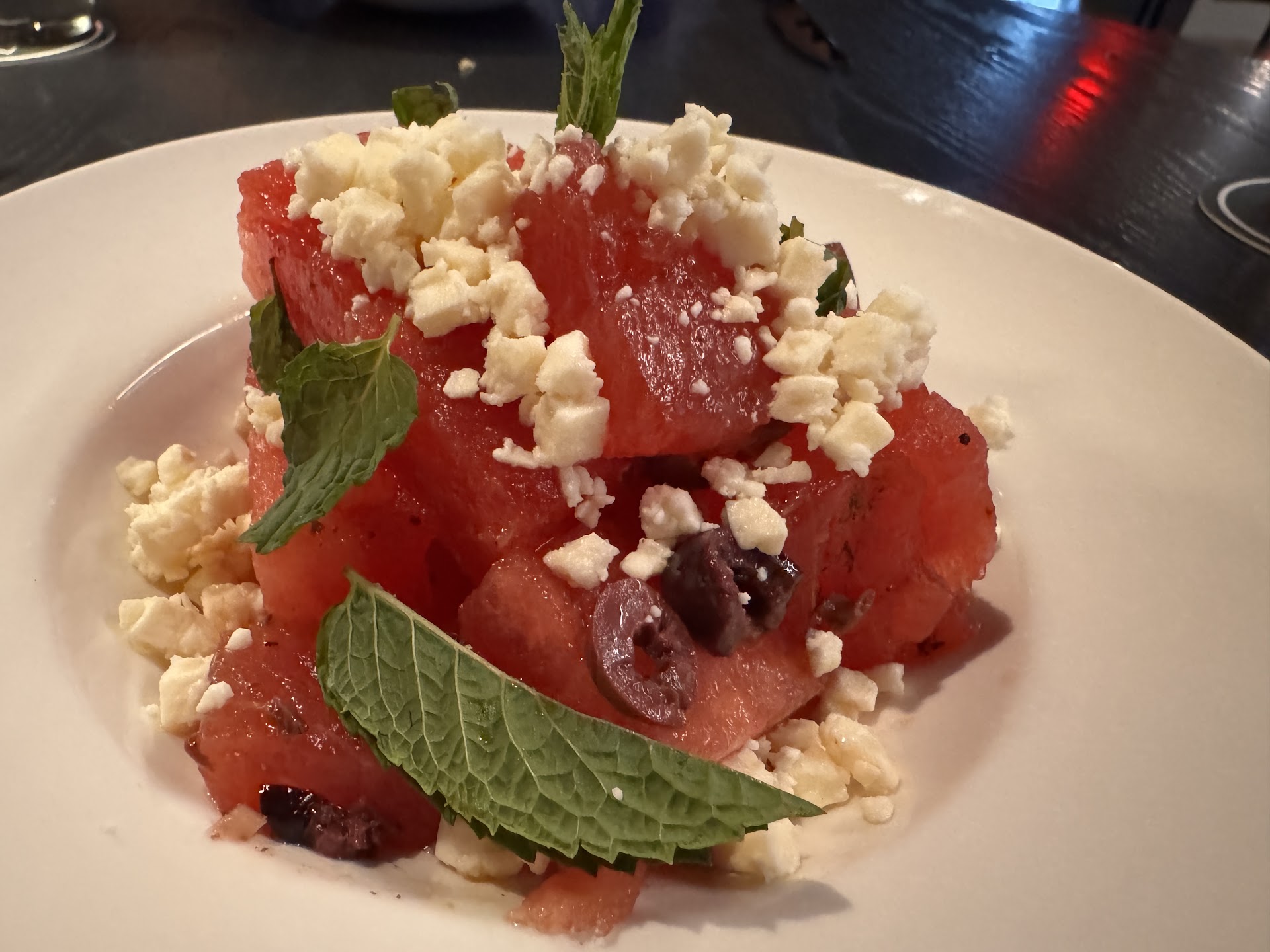 We started our dining experience with the Baked Potato Rolls. They were delightful and were a unique offering amongst the sea of the traditional bread offerings typically served. Next came the watermelon salad, which had the perfect blend of sweet and sour. Watermelon salads are exceedingly rare on menus around here, and I’m so glad that they chose to include one. It’s a very light and fresh way to start the meal. Our entrees included the Pork Schnitzel with puréed potatoes and the Lobster Bucatini. The schnitzel was abundant and cooked to perfection. It was topped with a picked fennel which was a nice touch. It was served over a bed of whipped potatoes, which although were not extraordinary, were still good in their own right. I also liked the fact that they were green, as even though the color didn’t affect the taste in the least, was a very unique presentation. The bucatini included large chunks of lobster and the pasta was the ideal texture. We really enjoyed the flavor and freshness of the dish. To close out our dining experience, we selected the Mexican Hot Chocolate pot d crème and the “Old Fashioned” bread pudding. Both were decadent and the perfect conclusion to our meal.