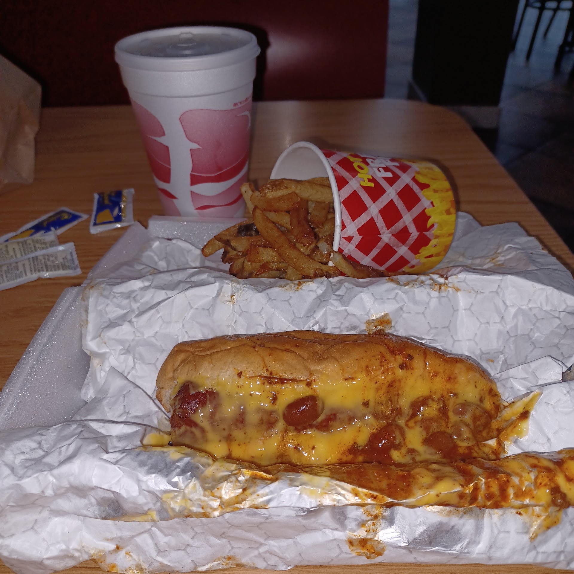The tables were sticky and dirty. The floors were so sticky every step sounded like you were peeling your shoes off the floor. The chairs were absolutely disgusting to touch and the highchairs were unusable because of how nasty they were. The condiments were on a janky broken table. There were no lids for regular drinks or napkins (until some nice kid got them for us eventually and this kid is the only reason this place doesn't rate 0 stars). The soda machine area was nasty, sticky, and dirty. There was no tea. The fries were clearly from yesterday, were cold, and not seasoned. It was straight up sad. I'm so...