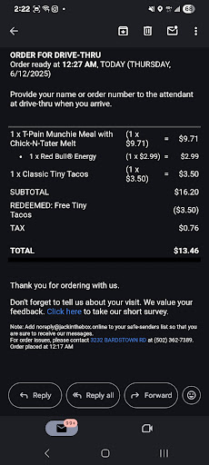 Read moreAbsolutely terrible! Worst fast food restaurant I’ve ever been to say the least. My friends and I stopped in during travel around 11pm last night as our first time in. We had placed a pickup order about 15 minutes prior to make our long travel easier. It had told us it would take 8-9 minutes and we chose to pickup through drive thru. When we got there the line was out to the road but we commited to stay in the drive through line as we saw people not being helped at the door/pickup window (you could see workers sitting at tables goofing around). It had taken 45 minutes at least to even make it up to the speaker to tell them we had a drive thru pickup order and we had to continue to wait 20 minutes when we got to the speaker to even be helped then got told they would be with us in a second as music was blasting in the background. When she got back with us she told us we had to actually park and walk up to the window for a pick up order after we had told her we selected the drive through option. We continued to park and walk to the window and waited another 5 minutes to get a completely wrong order. When we told them we got the wrong food they proceeded to hand us what seemed to be the right food however my mini tacos I was super excited about were missing along with some onion rings and all of our sauce. Also when we got our food by that time it was ice cold and our arrival time for home moved an hour and a half back. We were extremely disappointed with the service that took place here and we might never come back to a Jack in the box again after that experience. I hope you guys get the help you...