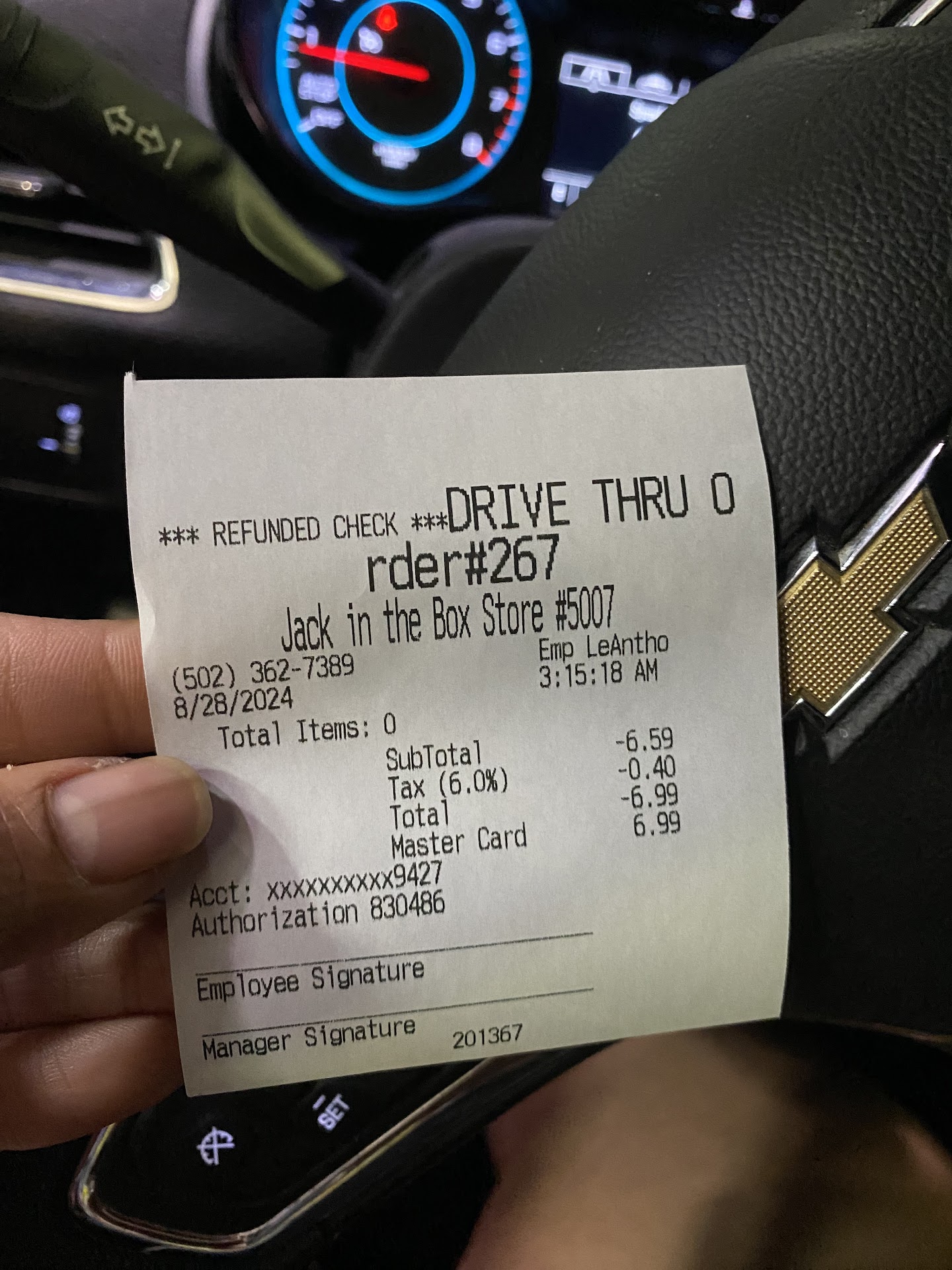 Update to the update: As of today nearly 3 week's later, I have not received my money back and have recieve no communication from anyone associated with Jack in the Box even after going through their website that handles this sort if thing.