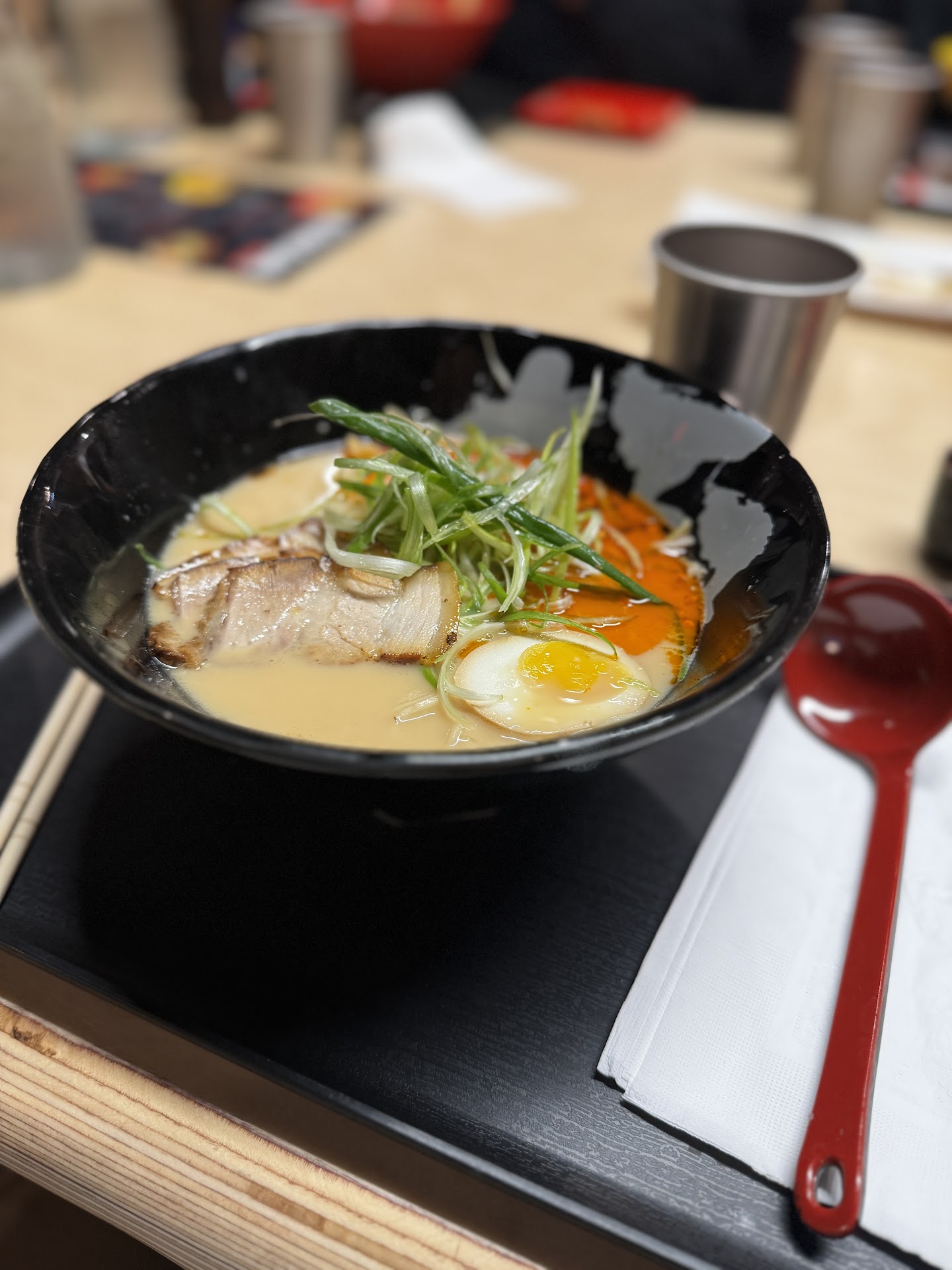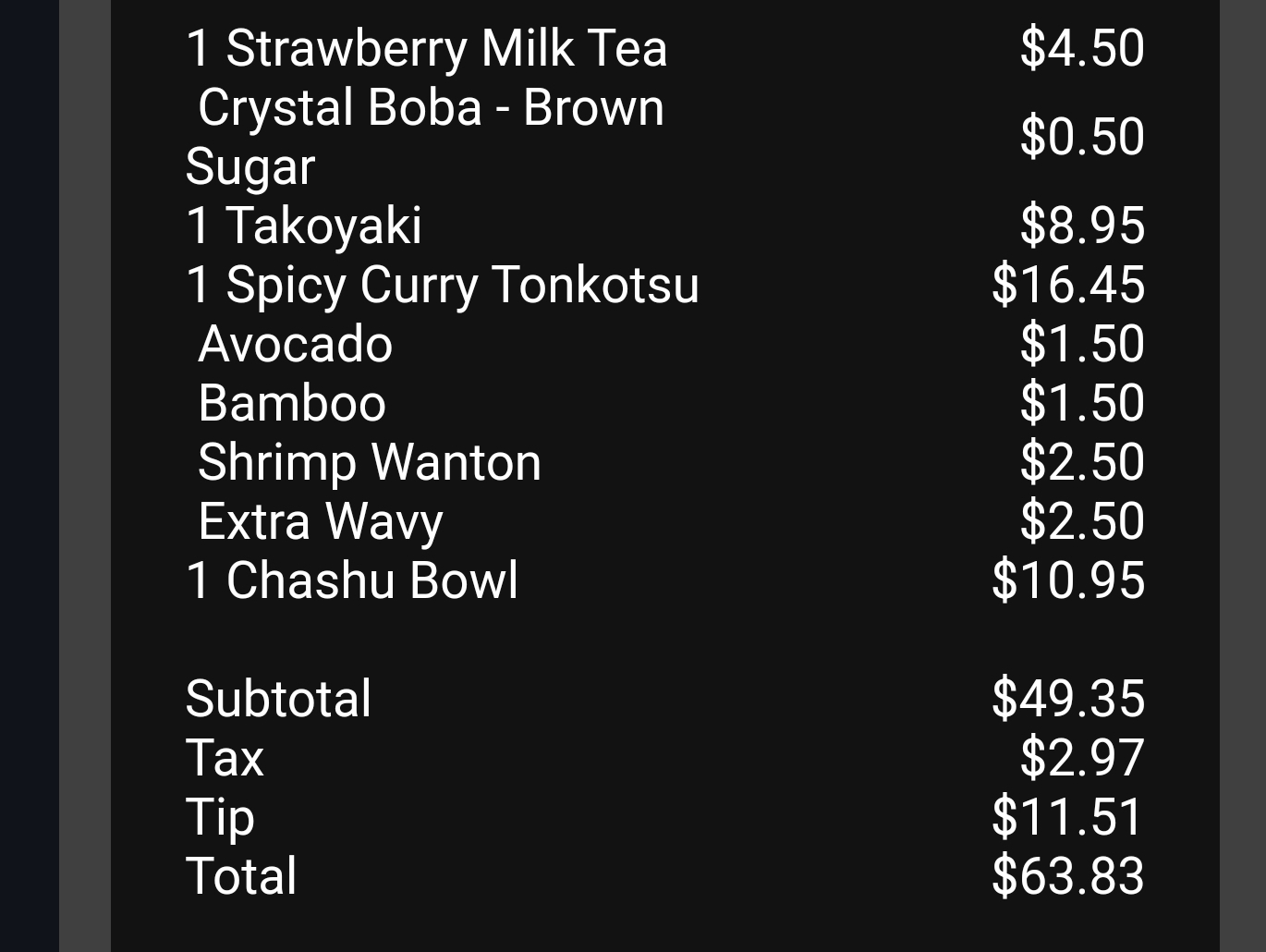 I ordered the Takoyaki Apppetizer (the best if you like calamari + small additions), Chashu Bowl, Spicy Curry Tonkotsu w/ a bunch of extra additives, and a strawberry milk tea with the brown sugar crystal boba added. All of it was top-notch delish! ( The ramen bowls are huge by the way, you could easily split one between two average appetites.)