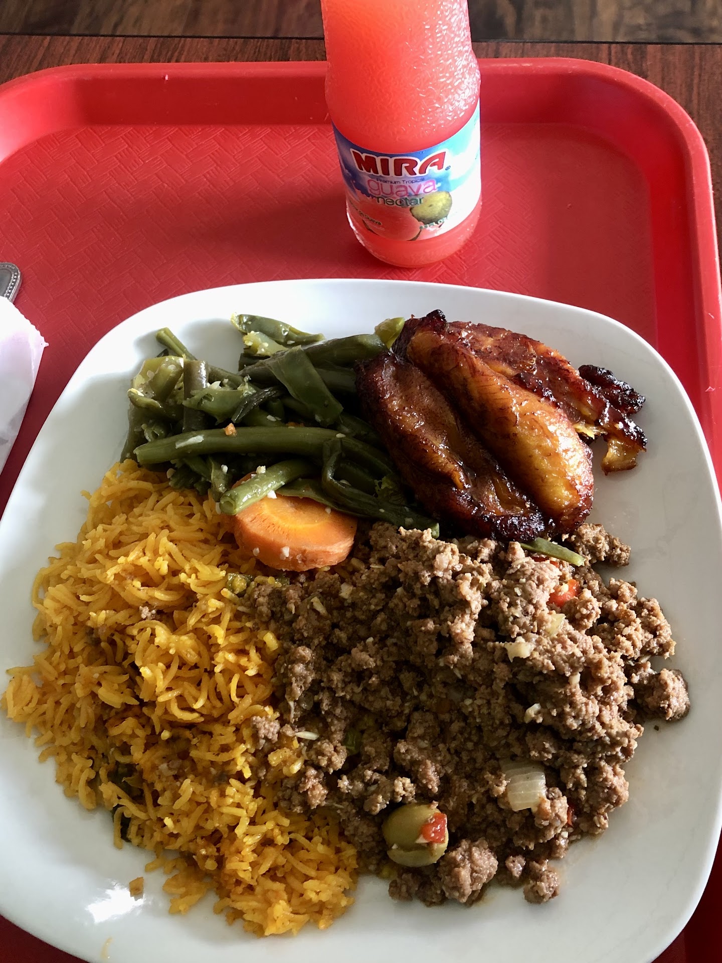 They are generous with portions! I actually had to indicate please no more on my plate, lol, and I still ended up waddling outta there stuffed! Everything looks mouthwateringly good, I will definitely return to try their other dishes. It was hard for me to choose, but I ended up going with a combo plate of beef mince/Picadillo, yellow rice, plantains, and vegetable medley (green beans and carrots). I got a cute little bottle of lucious guava nectar for beverage.