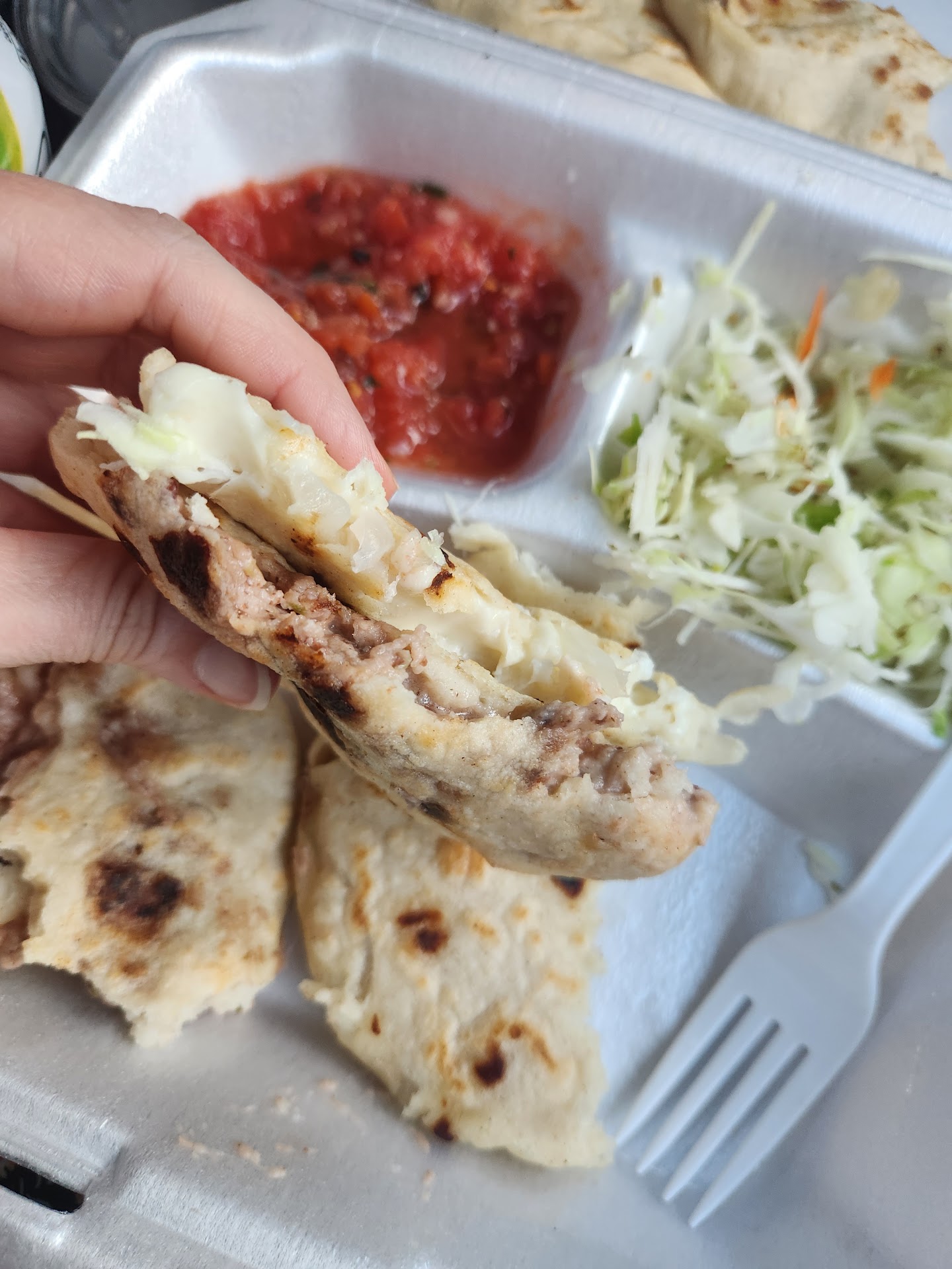 I had read in other reviews that it can take a while for the order to be made, so it helps to call ahead. The woman running this little stand hung up on me when I tried to order because I said I only wanted one. She said she didn't make just one, and hung up. So, I decided to go in person. When I arrived, I saw a sign that said it had to be an order of two or more. I ordered three (cash only, by the way). They all come with cheese, but I ordered one bean, one onion, and one chicken. I asked her what her own favorite one was, and she said none. š Okay, great start. The bean was good, but was boring. The cheese and onion was fine, but lacked the onion flavor I was hoping for. It was just raw onion with cheese. And then, the chicken tasted like canned chicken (and looked it) and was not good at all, unfortunately. I've had papusas before, so I kind of knew what to expect and this wasn't it. Aside from my experience, the place was popping at lunch and a ton of people were there... Maybe I just haven't found the...