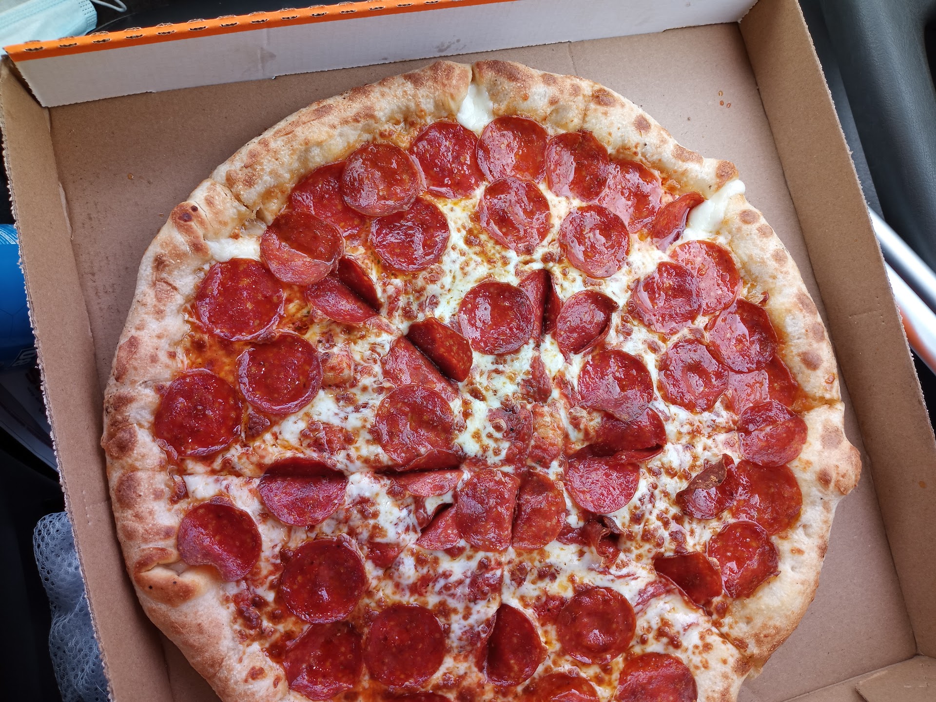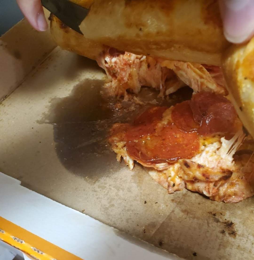 When I got home with my order, the sausage pizza was fine, but the stuffed crust pepperoni pizza was undercooked, massively greasy, and stuck to the box. The stuffed crust ends just fell apart when you grabbed them. We couldn't even eat it because the slices were fused to the cardboard.
