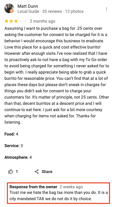 Read moreI think you missed the point there my friend. If I order a whole bunch of burritos, sure a bag makes sense. However If I order one or two burritos I don’t need a bag, don’t want a bag, so don’t give me a bag and don’t charge me for one. Even it was free, for environmental reasons I don’t want a bag unless the order is just too much to carry with two hands and I really feel I need one. So if you’re gonna charge for a bag that is not wanted or needed you at least owe it to your customers to ask if a bag is wanted. I work retail pretty close by and since the bag law has gone into effect we only charge 10 cents per bag, and we do so when a customer requests it, not automatically with the assumption the customer wants the bag and wants to pay for it. They are also much nicer bags. At 25 cents per cheap little white plastic bag that y’all use, I imagine you are making a profit every time but I can’t say with certainty because I don’t know what the city taxes you and your cost per bag though I imagine it is less than 25 cents. Tbh honest I love your restaurant, it’s fire!! Real good food at a reasonable price.. and to make up for the previous 3 star review, I’ll give this one 5 stars. I just wanted to be able to respond to your response because it seemed to miss the point. Don’t charge people for what they did not ask for. If you feel a bag is necessary ask the customer for consent to provide one and explain it costs something or do nothing at all and just hand over the food. I’ll keep coming back for burritos and hopefully In the future I won’t have to manually request no bag when I order 1 or 2 burritos togo. All this over 25 cents is silly, but you guys run a good business and I like coming here so I feel the feedback is needed from one human to another on the never ending path of improvement. Hopefully my words here have landed, keep up the good food and I’ll keep...