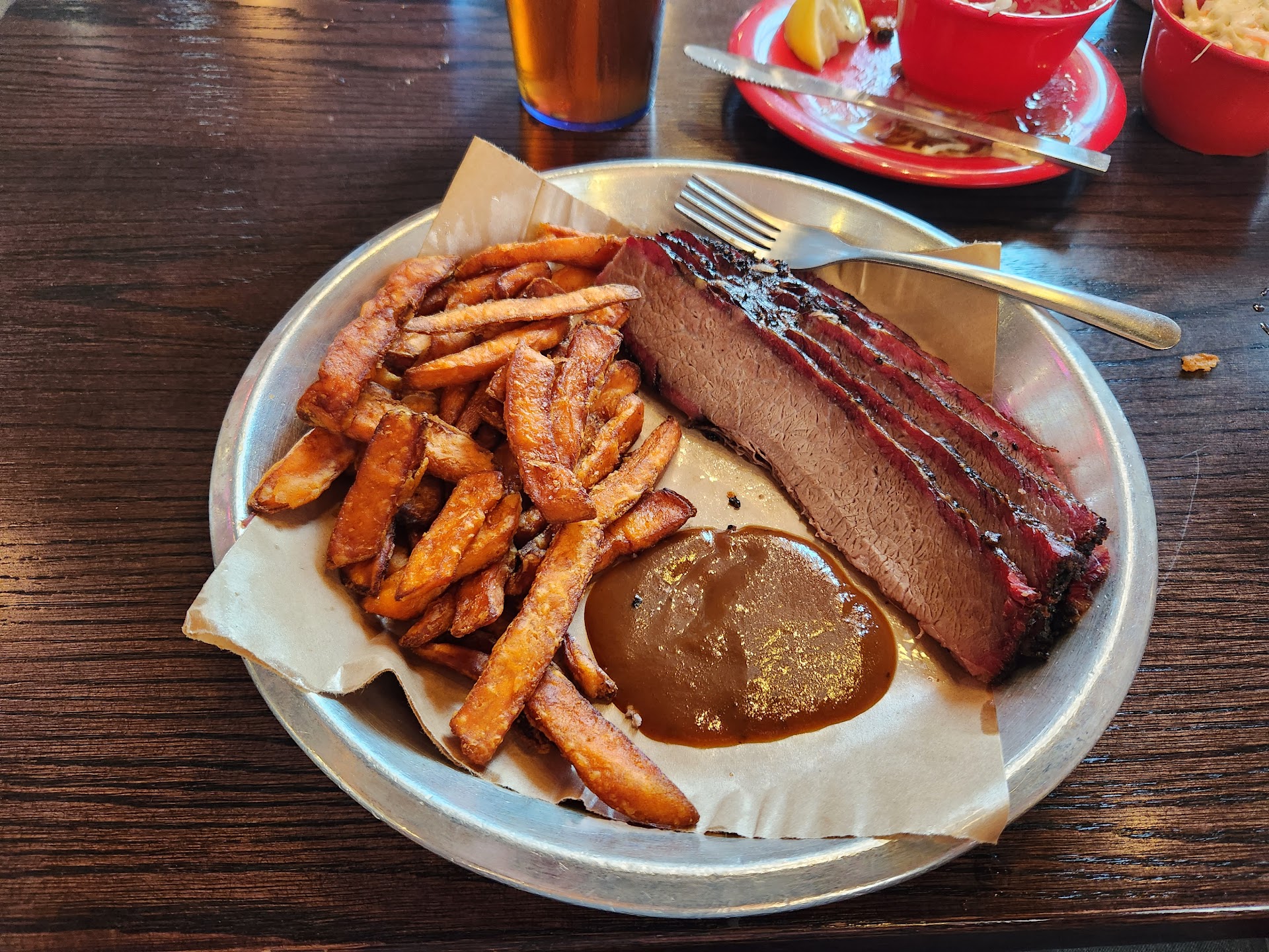 I was fixing to walk out until someone came by and showed us a table (there were open tables this entire time). We got the same, but different, improved, message on the food. Some is out but not all. We ordered 3 different meats; ribs, turkey, brisket, and it was over $35. It was enough for a single large person but given the cost, and that I'm annoyed at this point, we figured we would just split it. The ribs were great, I'm not really a turkey person but it tasted like turkey, and sadly the brisket was awful. Extremely dry and tough. I am used to at least a little bit of glisten of juice in brisket but this was dry. Their sauces were good, and I can see now why there was an emphasis on sauce. I left with the impression that they want to be a brewery or a bar, that might have, occasionally, subpar BBQ available. It may be easier to just become a bar and have a food...