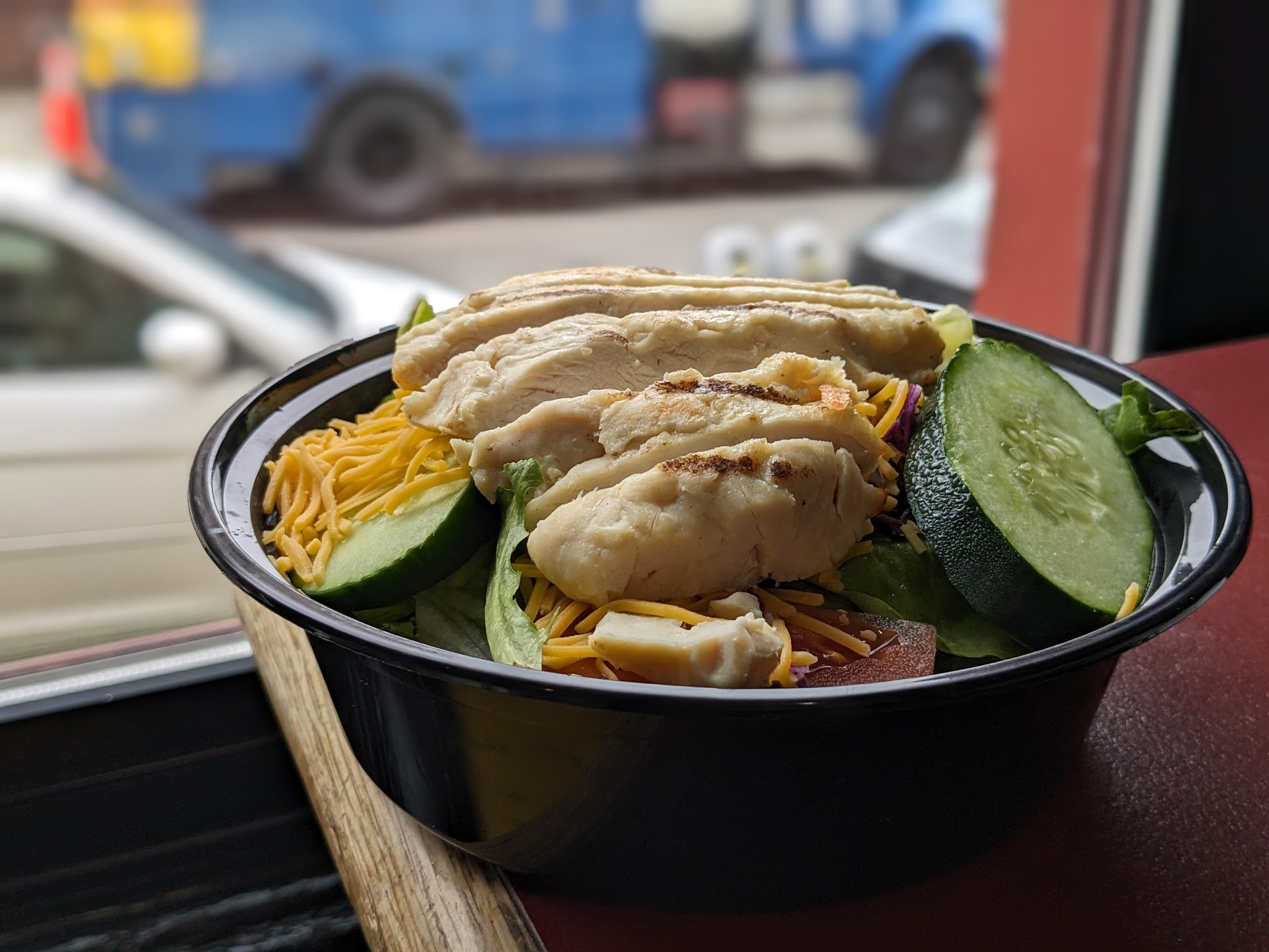 Read moreMain Eatery has the best cooked chicken I've ever had. I can't stress enough how good this chicken was. The gentleman working at the counter explained how it was prepared, with seasoning, cooking, and pressing. I listened and understood, but I didn't fully grasp what he was saying. I ordered a typical salad and got the chicken on top as a protein. As per my usual style, I eat the salad first and save the protein for the end as a little treat. Even after consuming my salad, the chicken was still warm. And it was still moist. And it was definitely delicious. But the thing I couldn't believe was just how moist and tender it was. I'm so used to salads with cold and dry chicken on top. This was anything but typical. The salad came with two cups of dressing on the side. I didn't even use them, that's how good this chicken was. Get whatever else you want here, but make sure you try the grilled chicken too.
