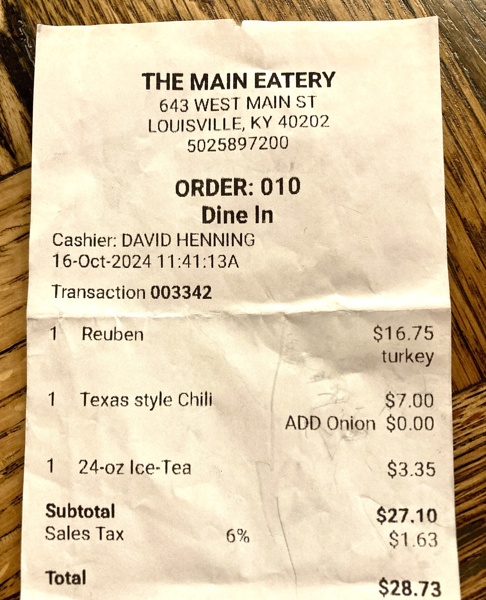 First off, their hours are annoying. They are literally only open 15 hours a week. No joke. I don’t lead a 9-5 lifestyle so it’s not often that my schedule will allow me to go there and get my favorite Ruben in town. On more than one occasion I’ve arrived there at 1:30pm, 30 minutes before they close, and been turned away for dine-in service. I was told I could order something to go, but they were closing soon (2pm) and I would have to leave immediately with a carry-out. So I guess I’ve been trained to show up really early, when I am able, to get my favorite Ruben in town.