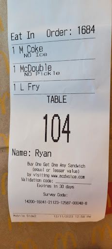 Read moreDown with the Clown! I went thru the drive thru when they were having their $.50 double cheese burger deal. I ordered two of them & saw on the screen I was charged full price. They told me you had to do it thru the app, I tried to get it to download while in line but ended up paying full price for them. Got back to work to find my double cheese burgers were really a single burger with two slices of cheese. So today I go in to order breakfast & told the manager what had happened. She said I must have gotten the wrong order. I explained that I did not as everything else was correct & the receipt said two double cheese burgers. Once again all she said was you must have gotten the wrong order. Look first of all, they handed me the order so it was their issue not mine. This manager didn't even apologize for them getting the order wrong or offer any kind of compensation. Sounds like McDonalds needs to do some...