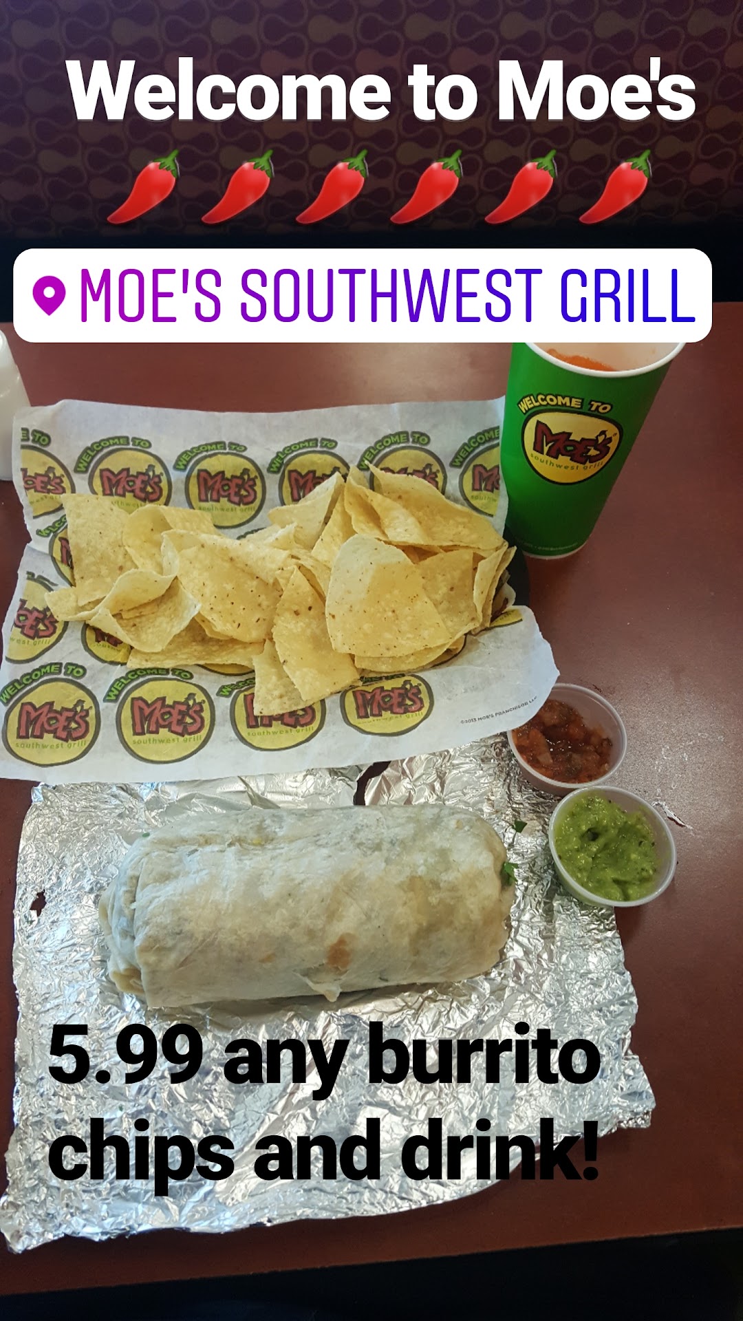 Ā Ā Ā Read moreMoe's is a great Tex Mex quick eats restaurant with delicious options! Burritos, tacos, salads, and endless chips with a salsa bar, makes this a great option for families with different tastes. Mondays are "Moe's Mondays" where you can get a burrito/chips/drink combo for $5.99! If you download the app, you can get rewards and points for deals and after 1000 points, you get a $10 credit to use on your future purchase! Online ordering is still a little glitchy for me, making a single burrito that is normally $7 or so, ring up at $22. I haven't figured out how to fix that but ordering in store is always a...