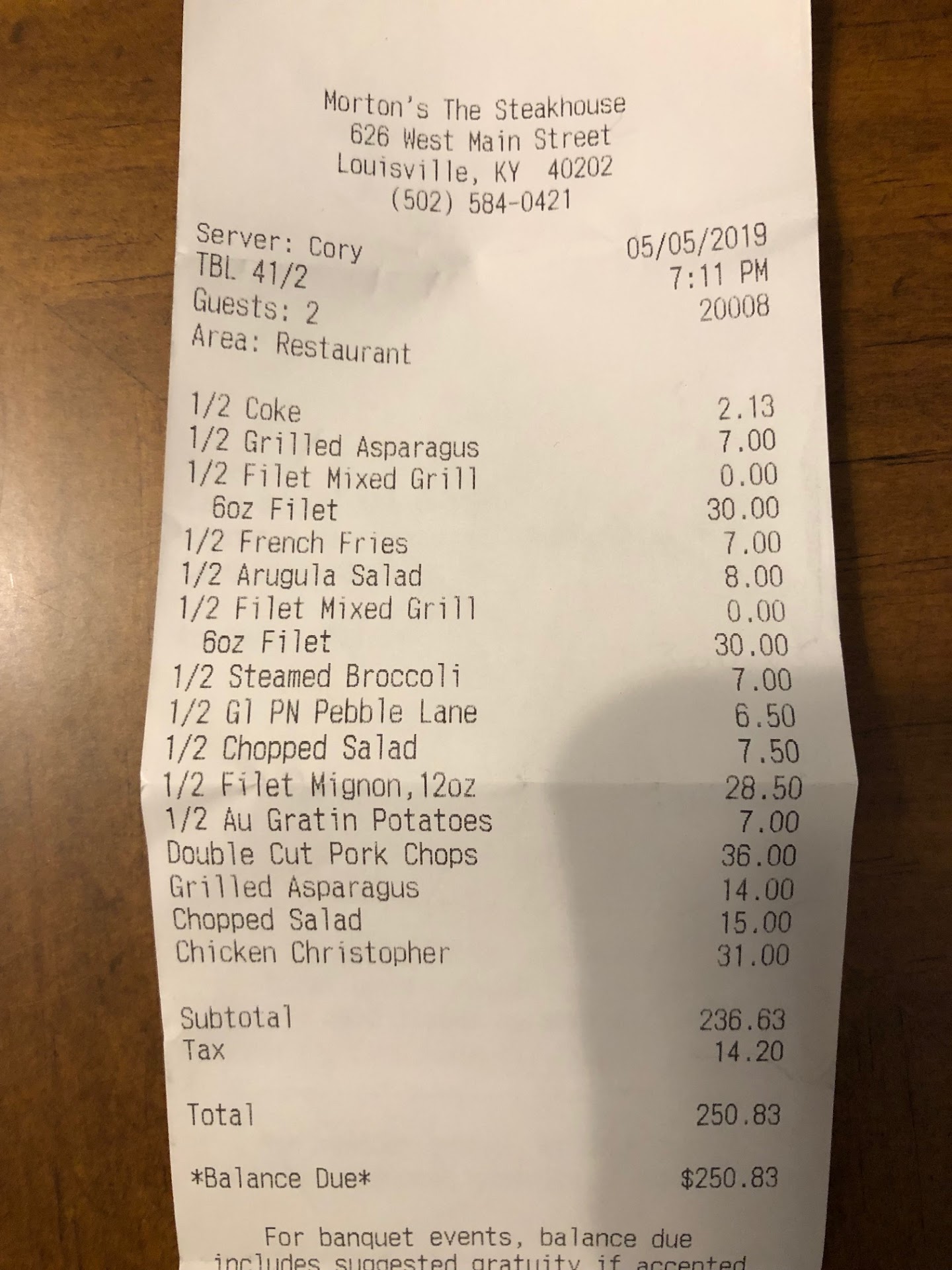 Read moreMe and my boyfriend went to this place Friday night to celebrate our anniversary. We had a long day at work, and wanted to unwind and celebrate with a nice bottle of wine . My boyfriend has been to this place before, but it was my first time . Worst experience ever. My boyfriend was being friendly and just talking to the hostess about how we had just moved up the street, and that we’ve tried all of the restaurants in the area, but he hasn’t been to this one in a while and he wanted me to try it . The hostess basically rolled his eyes and told him that he would get us seated shortly. We waited for about 10 minutes, and a table next to the bar became available so we sat there until we could get a regular table . My boyfriend told the bartender that he already knew what kind of wine he wanted and to go ahead and bring it to us, so we could drink it while waiting for our table . She said ok, then my boyfriend asked the hostess how much longer it would be for our table and he said one would be available shortly because they were at their max capacity. So we continued to wait at the table by the bar . While thinking we were waiting on a bottle of wine, apparently the hostess and bartender got together and complained to the general manager about serving us alcohol. She came to our table and told us that she was happy to seat us but we couldn’t have any alcohol because the staff were “concerned “ like are you kidding me ? The staff couldn’t handle someone talking to them and having a normal conversation? My boyfriend told the general manager that we haven’t drank in almost 6 weeks because we were getting into health and working out, so he didn’t drank a drop of liquor that night. She looked him up and down and said “congratulations but like I said, no alcohol “. Me and him just looked at each other very confused. I was just over it at the point and said it’s fine let’s just go get seated and order dinner. We sat down and the waitress gave us menus , then I saw the hostess walk over and whisper something in his ear . I’m assuming he told him not to serve us alcohol too since the waitress didn’t bother giving us a wine list . At that point we were both embarrassed and felt completely unwelcome and just decided to leave . The rude hostess didn’t say have a good night or anything. He just looked at us sideways with a smirk like he was glad we were leaving. We ended up going to Jeff Ruby’s up the street and felt WAY more welcome. The food was great and they were happy to serve us the 2 bottles of wine that we ordered, one was to take home .I will NEVER spend my money or allow my boyfriend to spend his in this place EVER!! We ordered a well worth it $730 meal at Jeff Ruby’s , where we were appreciated ! Too bad Morton’s lost a great potential regular customer. I’d give zero...