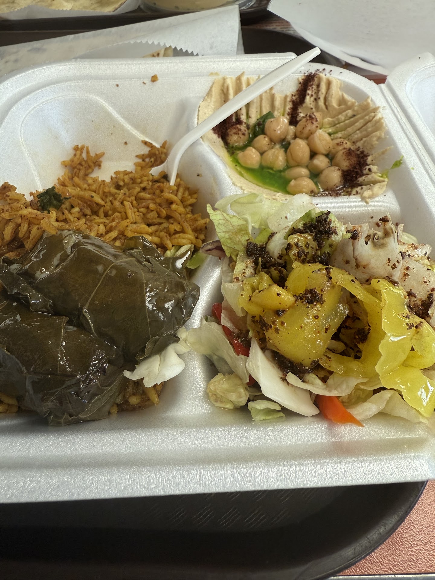 My wrap was perfectly toasted and extremely delicious. I dipped it in the spiced hummus which was pretty genius. The hummus is really good on its own, too. The falafel was perfect. They were nicely crisp on the outside and had a pleasant texture with grains/nuts, maybe? I definitely recommend those and the sauce that comes with them. There was a pretty good selection of cake/pie slices and baklava -- I think I saw almond, walnut, and pistachio (my favorite). I didn't see those until I was waiting (not long) for my food and had already paid, so I look forward to trying sweets on my next stop in.