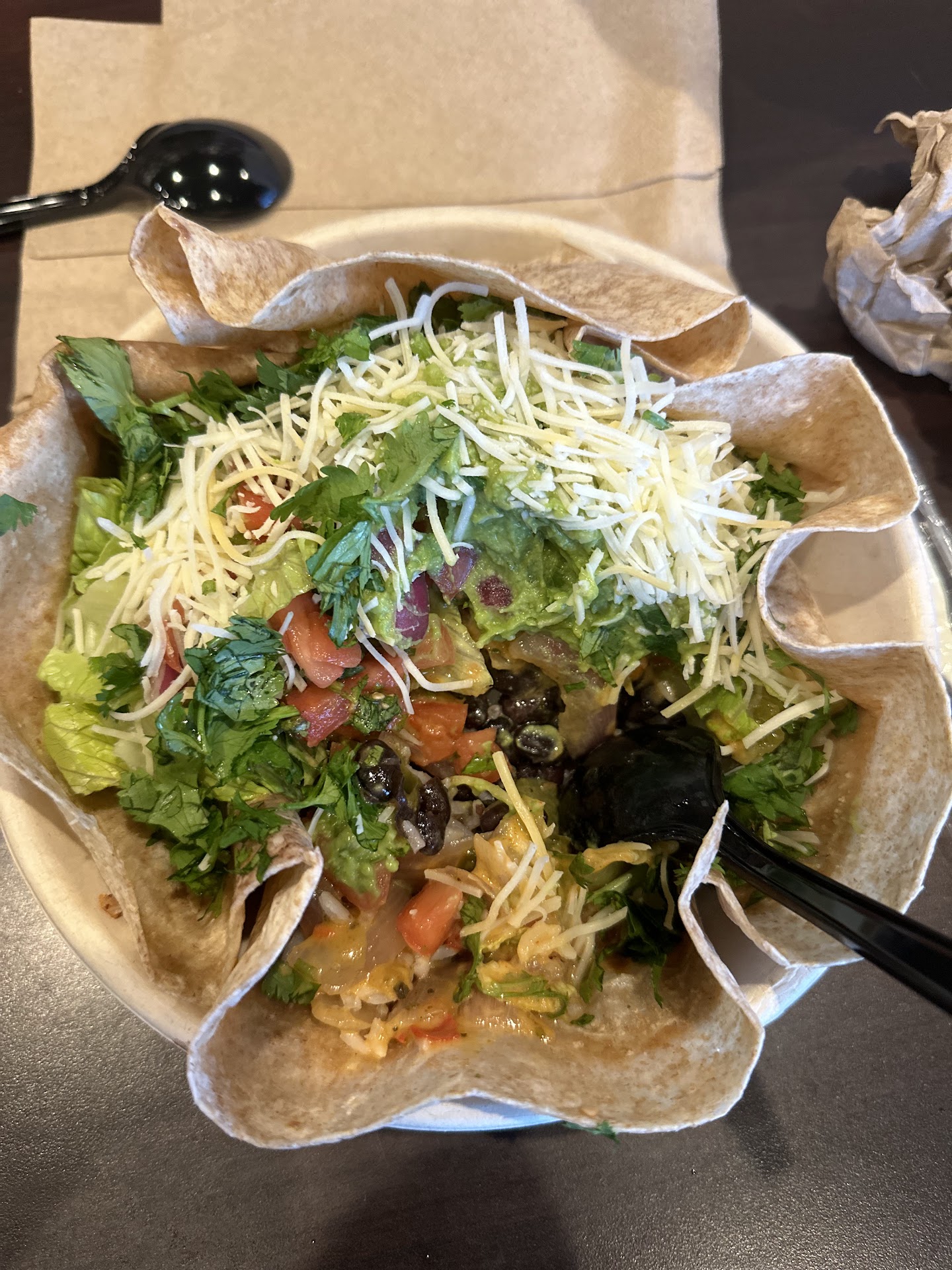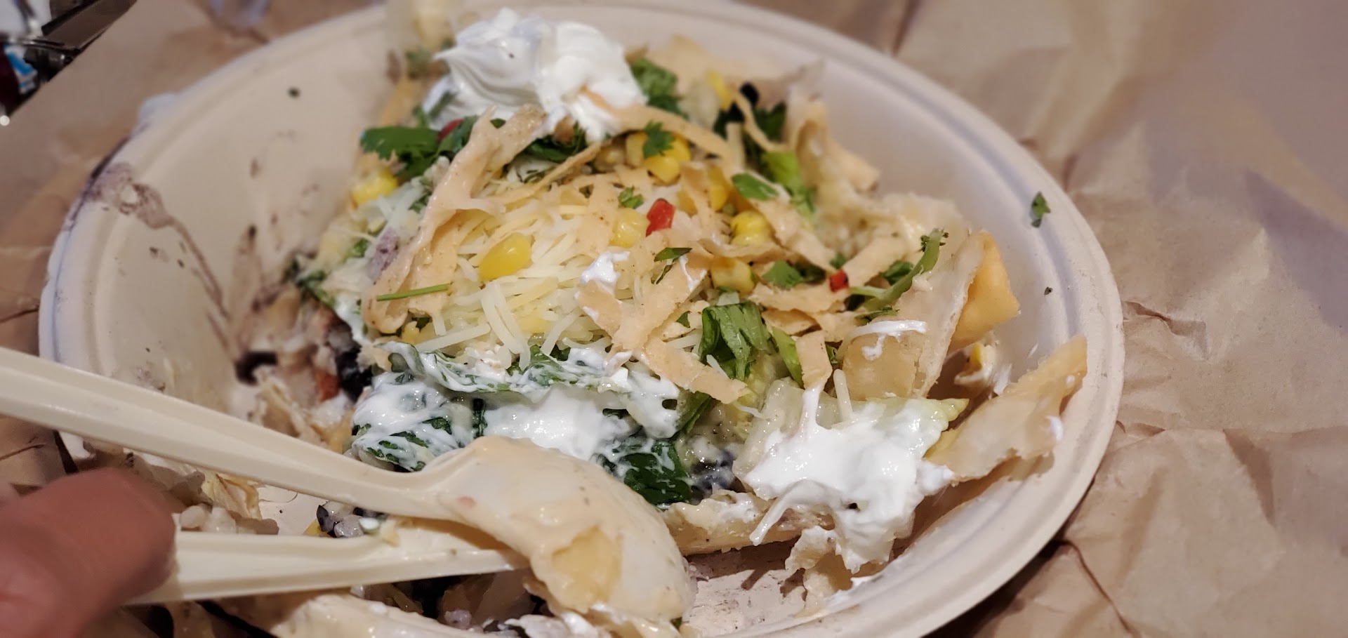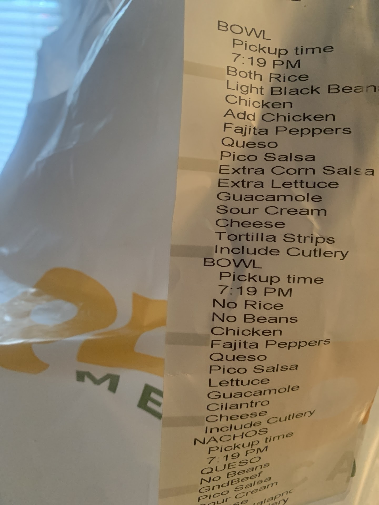 Read moreThis may just be one of the nastiest fast food experiences I have had to date. My boyfriend and I placed a DoorDash order and I asked for a Mexican Street Corn Chicken Bowl and a cup of Tortilla Soup (with the tortilla strips and sour cream). My boyfriend ordered his own choice of a burrito and chips with queso.